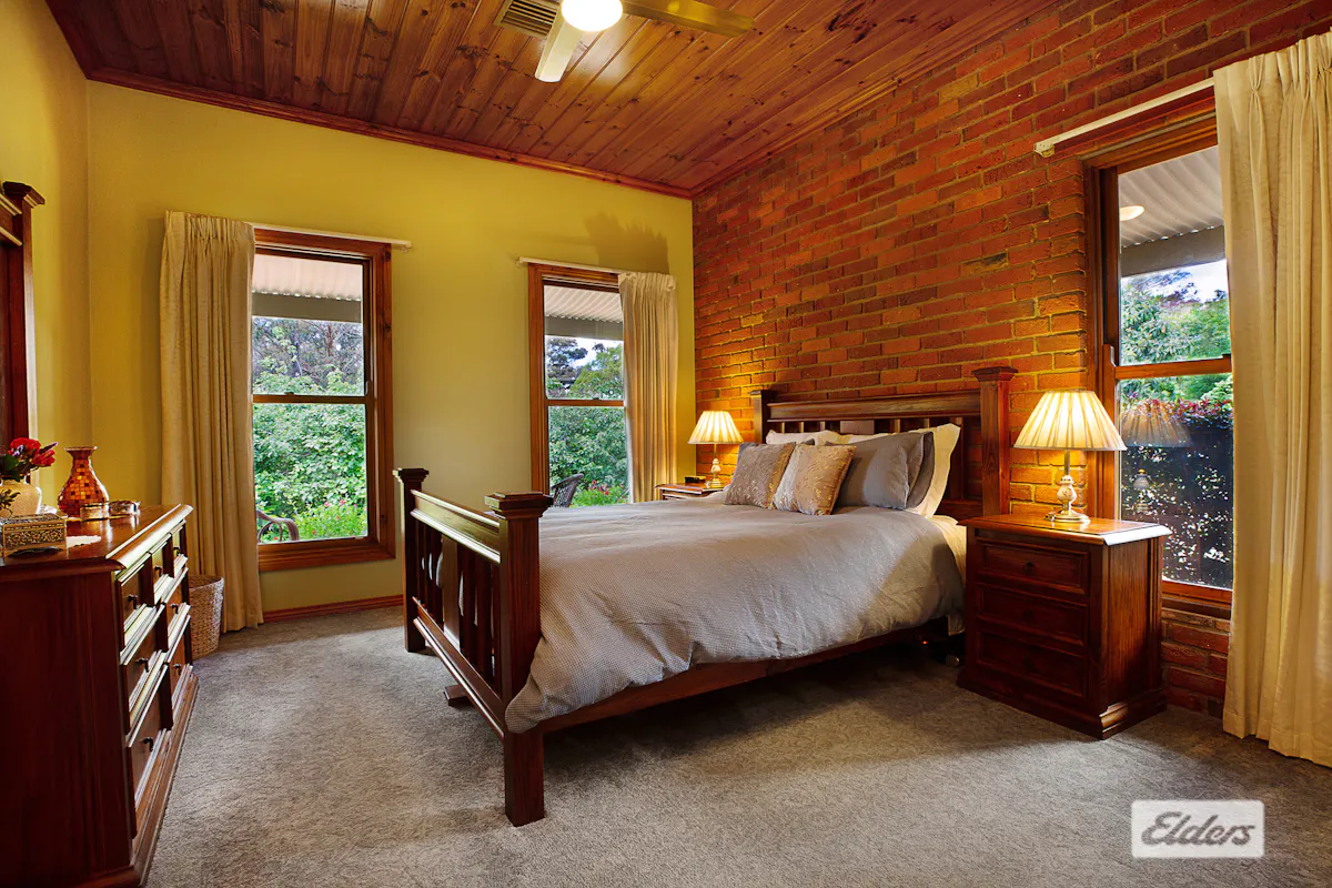 Rustic features can also be found in abundance, and many of the recycled materials that have become signatures of this property have been sourced locally. The home has a very warm and inviting feeling, particularly in the U-shaped semi-open plan living area, courtesy of features such as dado boards, highly textured rendered walls and an absolutely delightful country kitchen with traditional timber cabinetry, a leadlight display cupboard, solid timber benchtops and a servery to the living area.