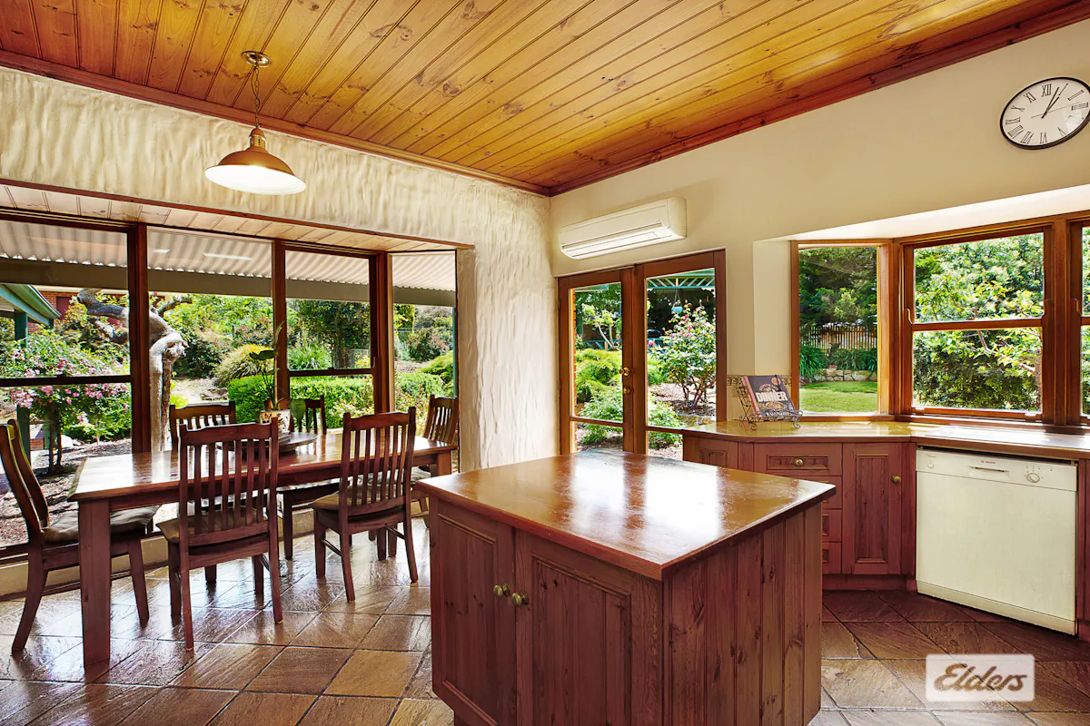 Even on approach, the style of the home, the traditional verandah and the reclaimed red bricks begin to tell the story. You will want to take some time to appreciate the stained glass leadlight transom window and sidelights that flank the front door, but your eye will be drawn in to the huge freestanding stone fireplace which takes pride of place in the formal lounge and stretches upward through a honey hued, timber lined cove ceiling. This room is so perfect and so is the lovely outlook from all of the timber framed sash windows, in fact every room in this house has a very pretty outlook over the manicured gardens that encompass the home.