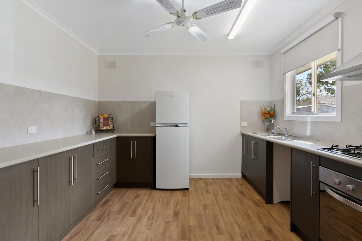 At the heart of the home lies the standout upgraded kitchen – a true highlight. Boasting ample bench space and smart storage solutions, it comes equipped with a freestanding gas cooktop, electric oven, ceiling fan, and provision for a dishwasher, making it as functional as it is stylish.