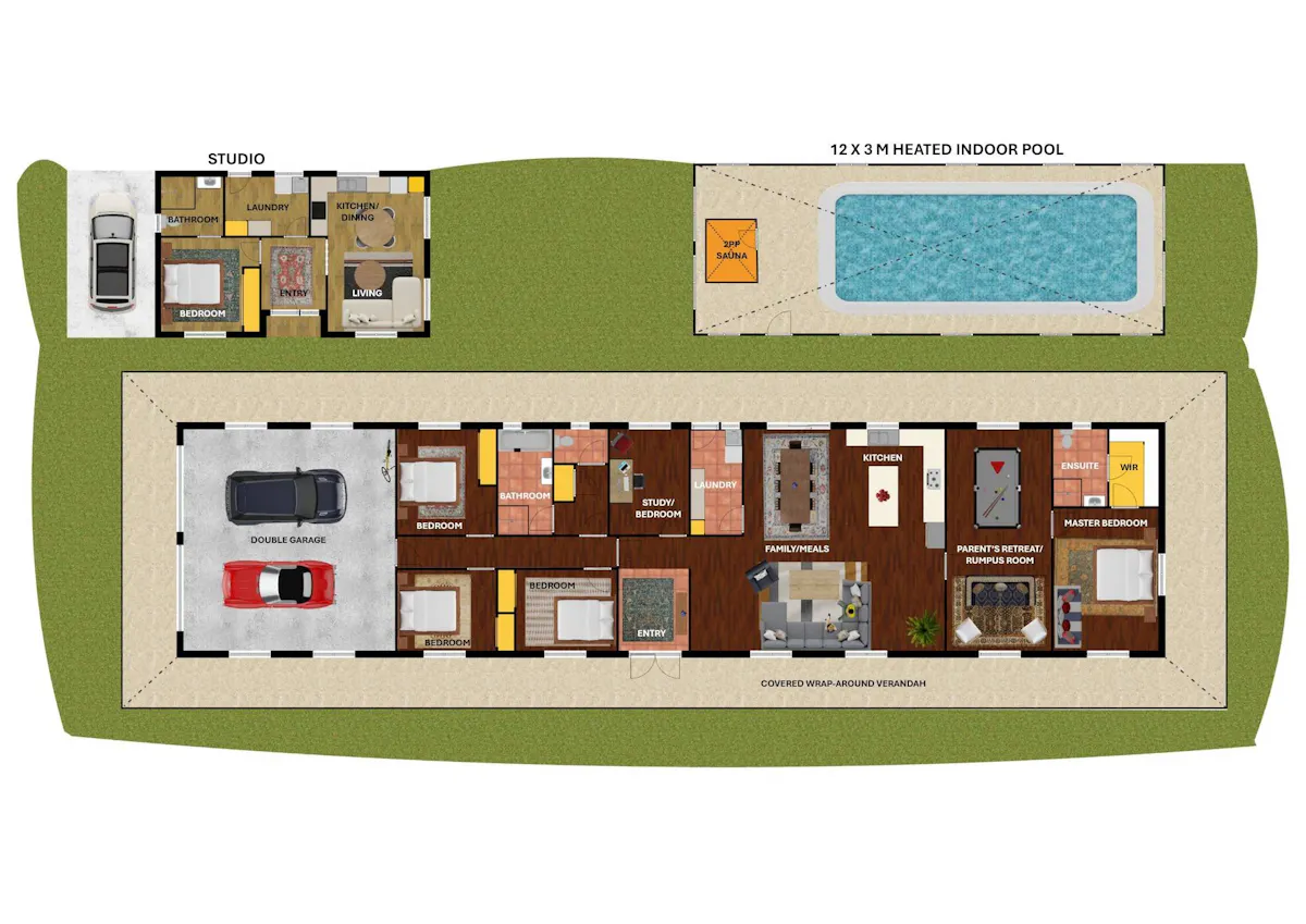 - 30m2 parent's retreat/rumpus room adjacent to the master bedroom