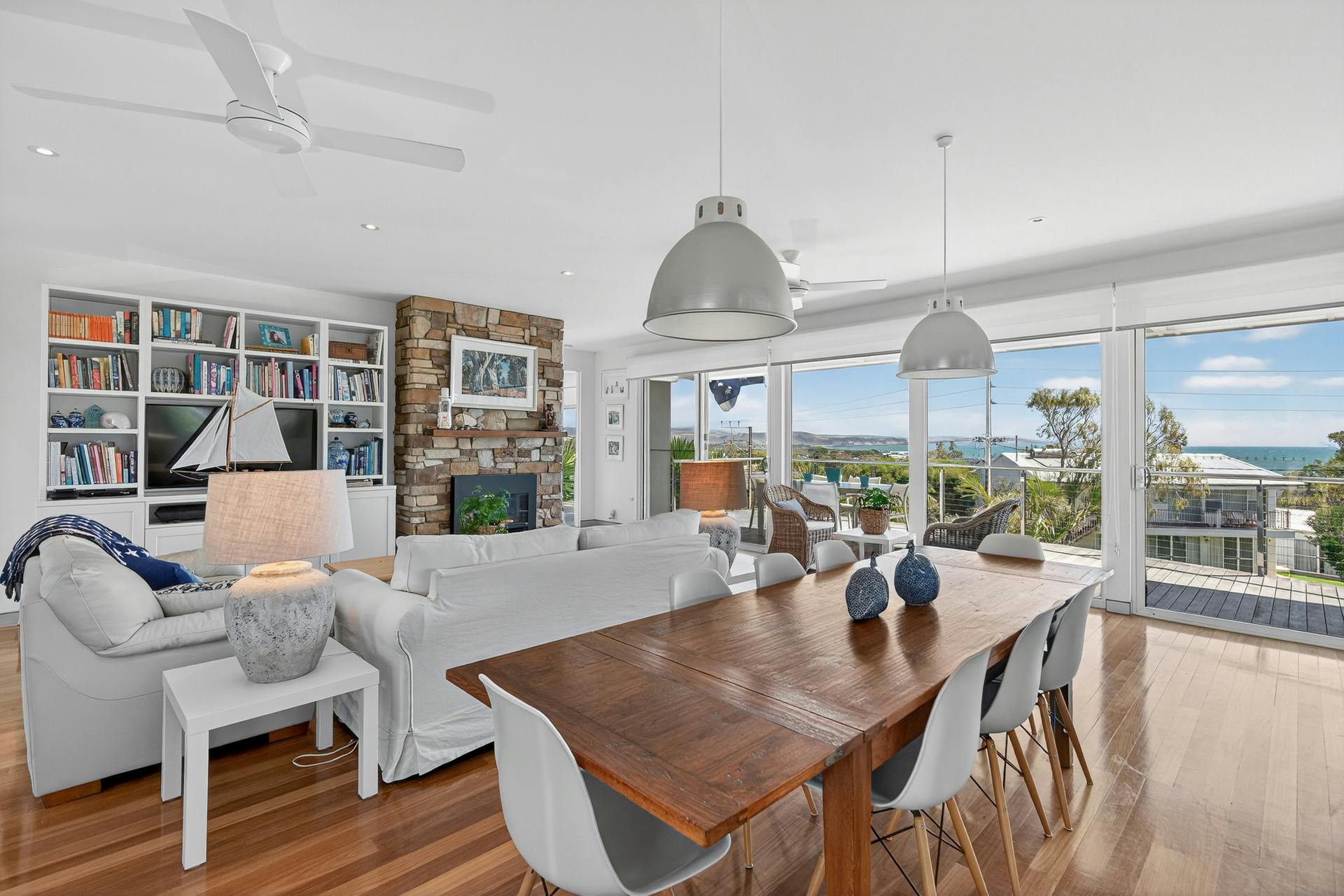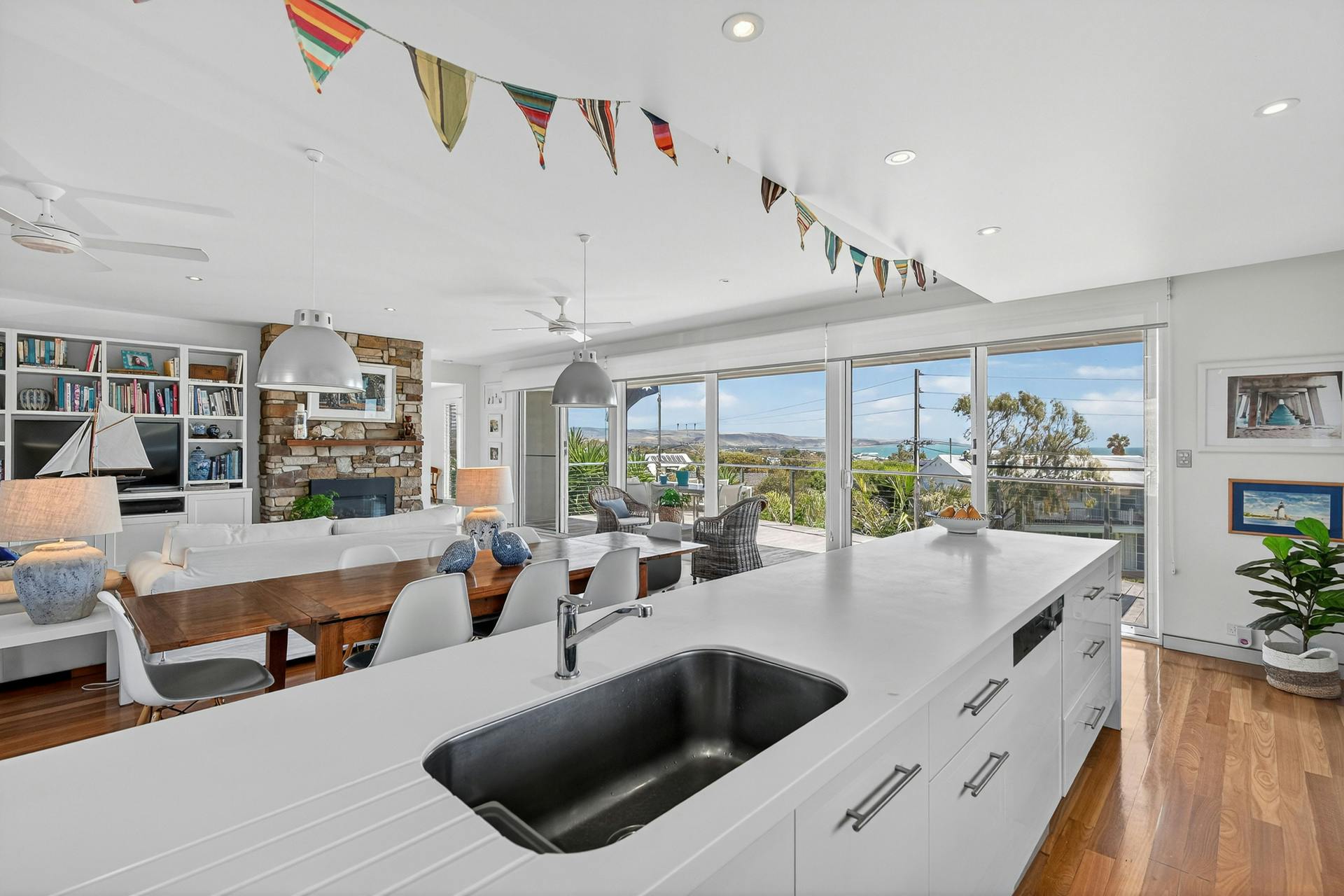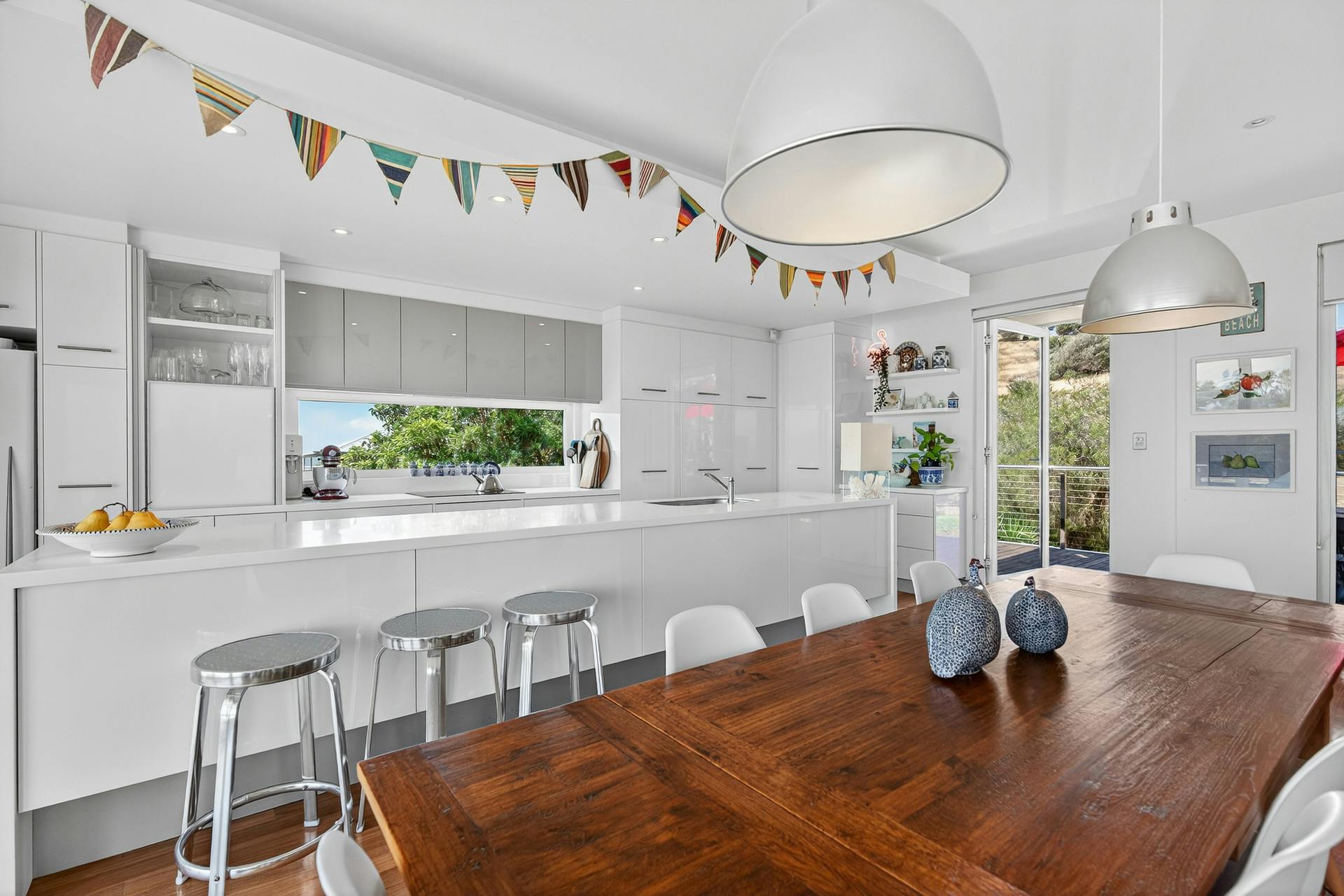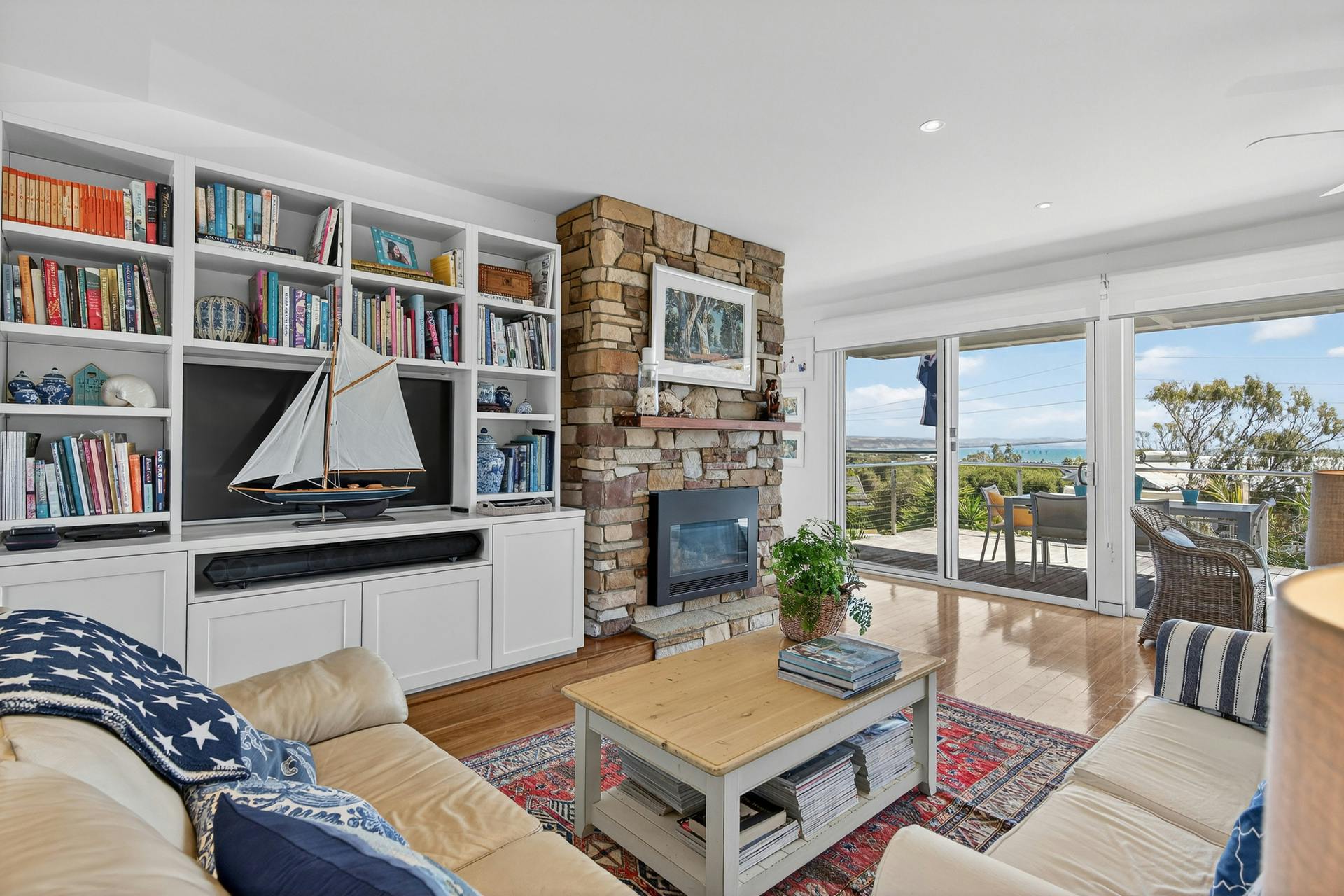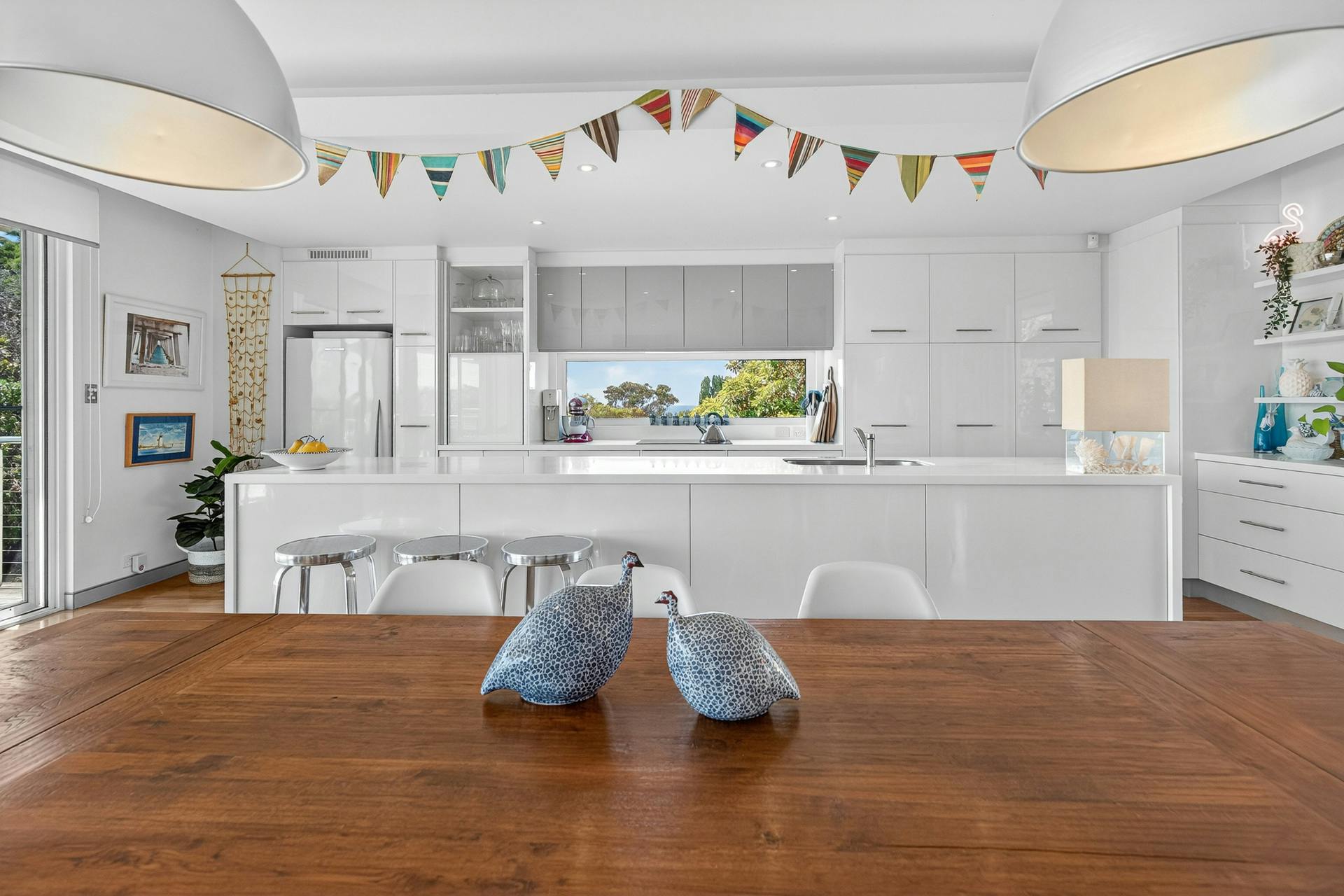 Once you reach the top of the stairs, the real magic begins. Feast your eyes on the deep blue sea views, the award-winning kitchen, or the reflection of the shimmering pool surrounded by lush tropical gardens - or perhaps it's the stone fireplace with its oversized timber mantle that captures your attention. This space lifts the soul and calms the mind. Perfectly appointed for entertaining, it offers sweeping views in both directions and opens seamlessly to front and rear decks. Out front, enjoy rugged coastline and sea views; to the rear, a natural bluff provides daily entertainment courtesy of resident kangaroos and an abundance of native birdlife.
