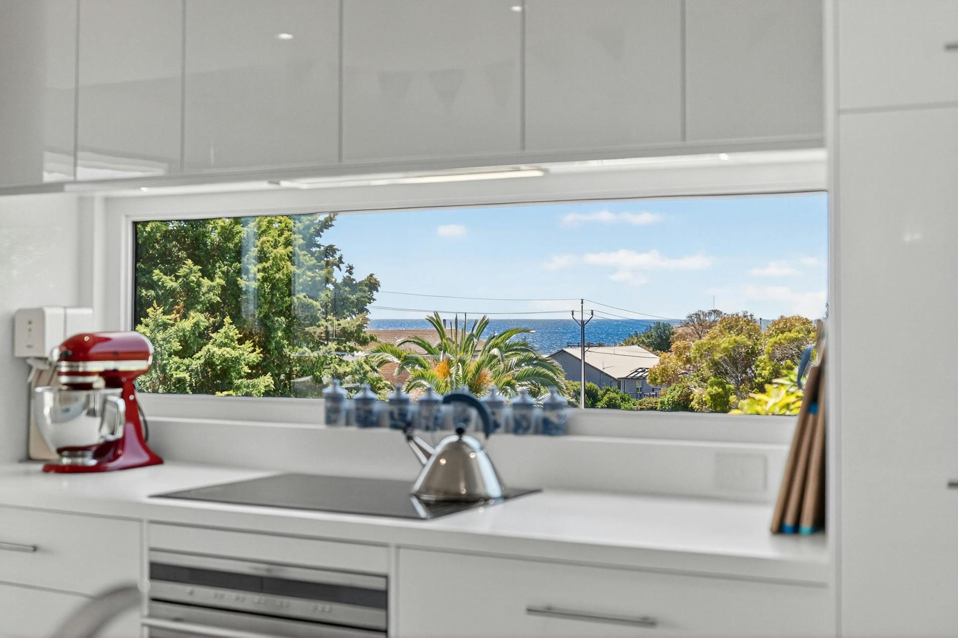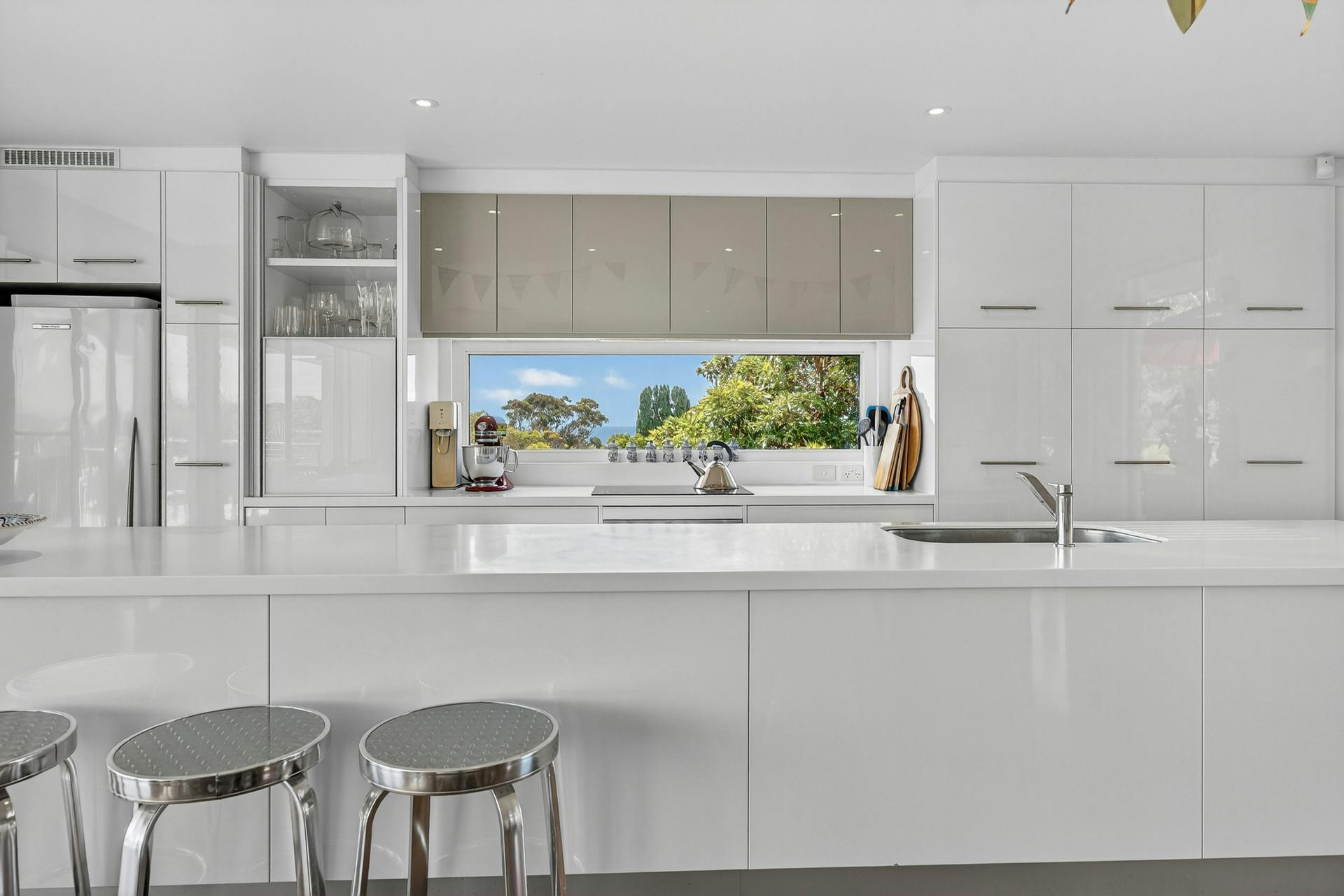 The kitchen is a masterpiece - as beautiful as it is practical. It features every bell and whistle, from a hidden coffee maker to stylish, high-quality fittings and fixtures. The glass splashback doubles as another window, framing yet another stunning and unique sea view. Bright, white, and easy to maintain, the space includes a waterfall stone benchtop on a huge island bench. Cooking here is a joy, and you're still part of the action - enjoying Carrickalinga sunsets or keeping an eye on the pool.