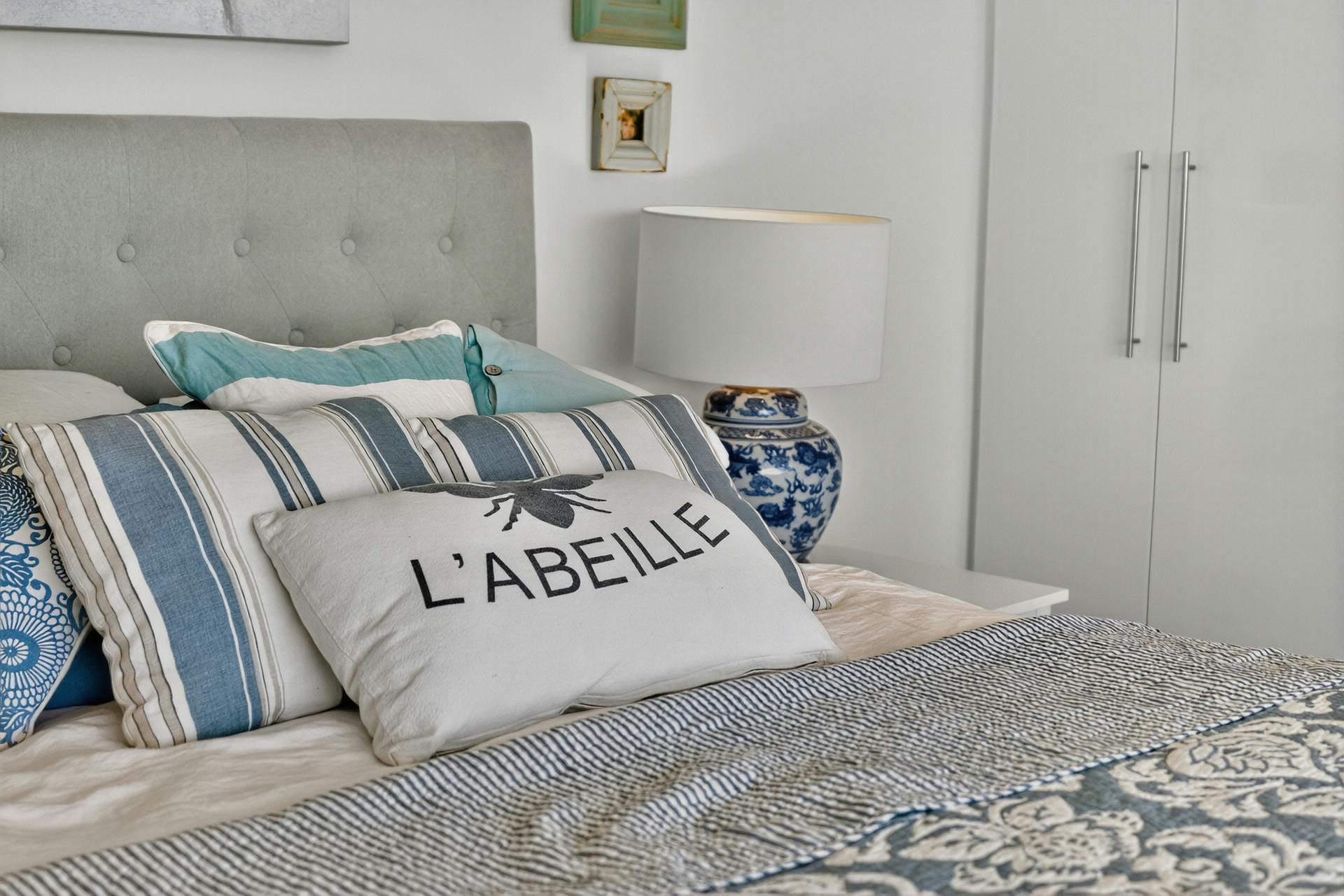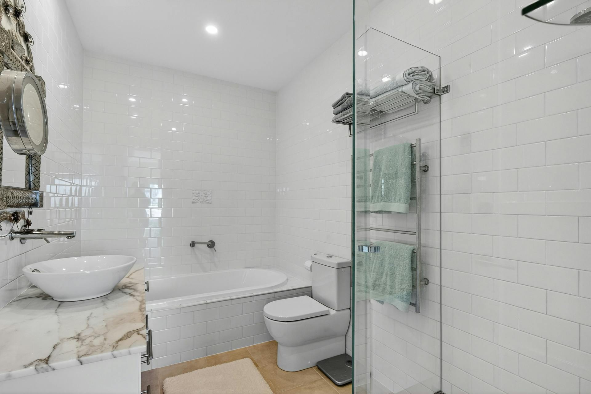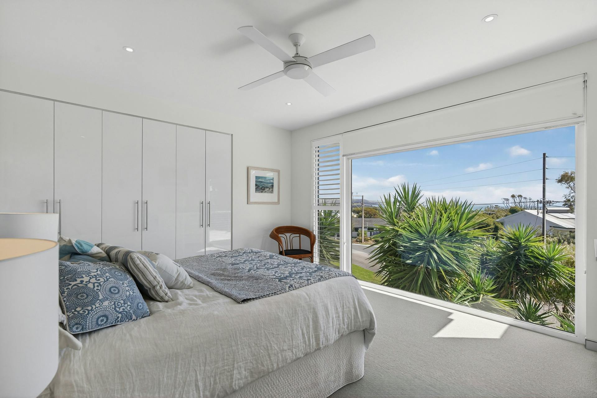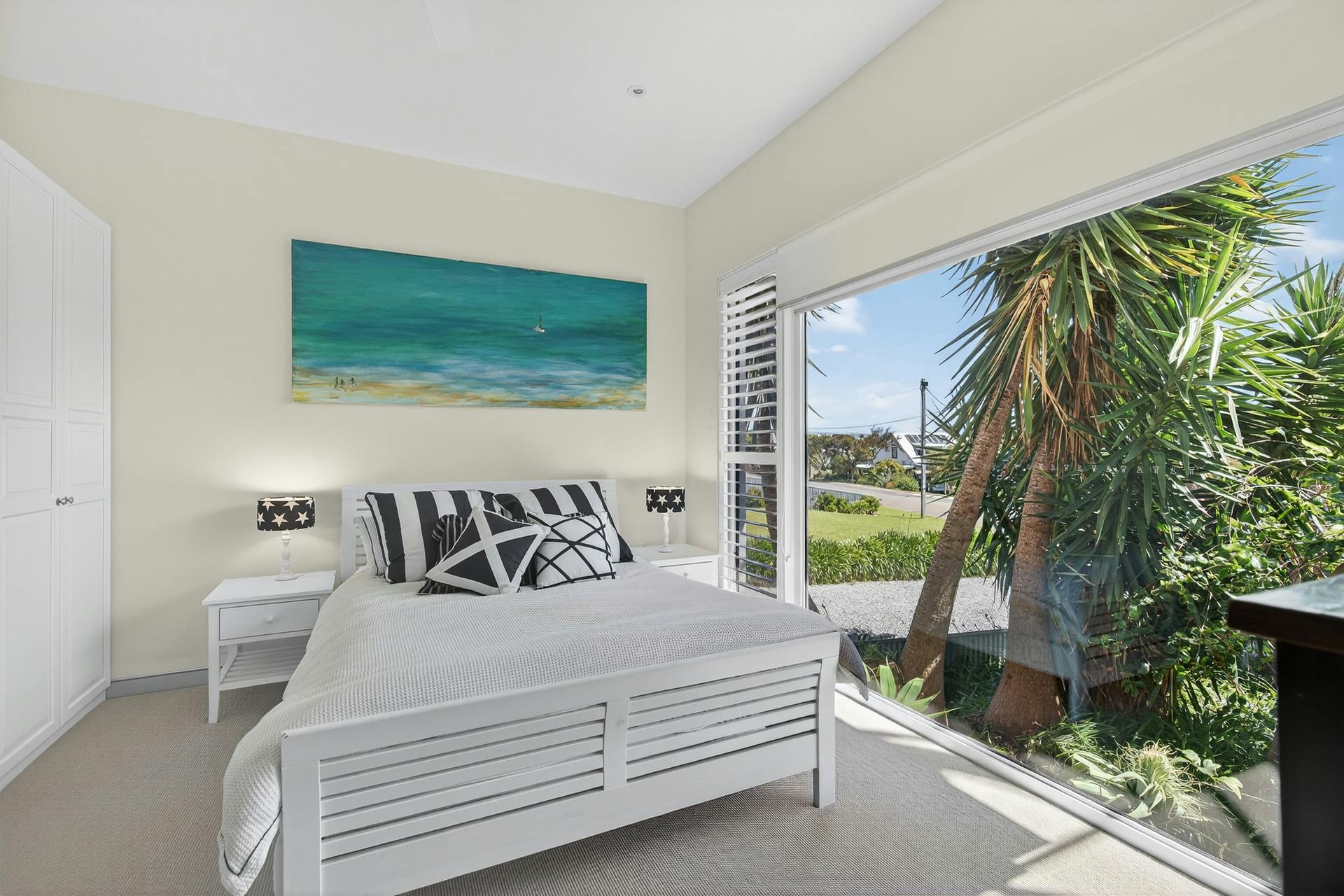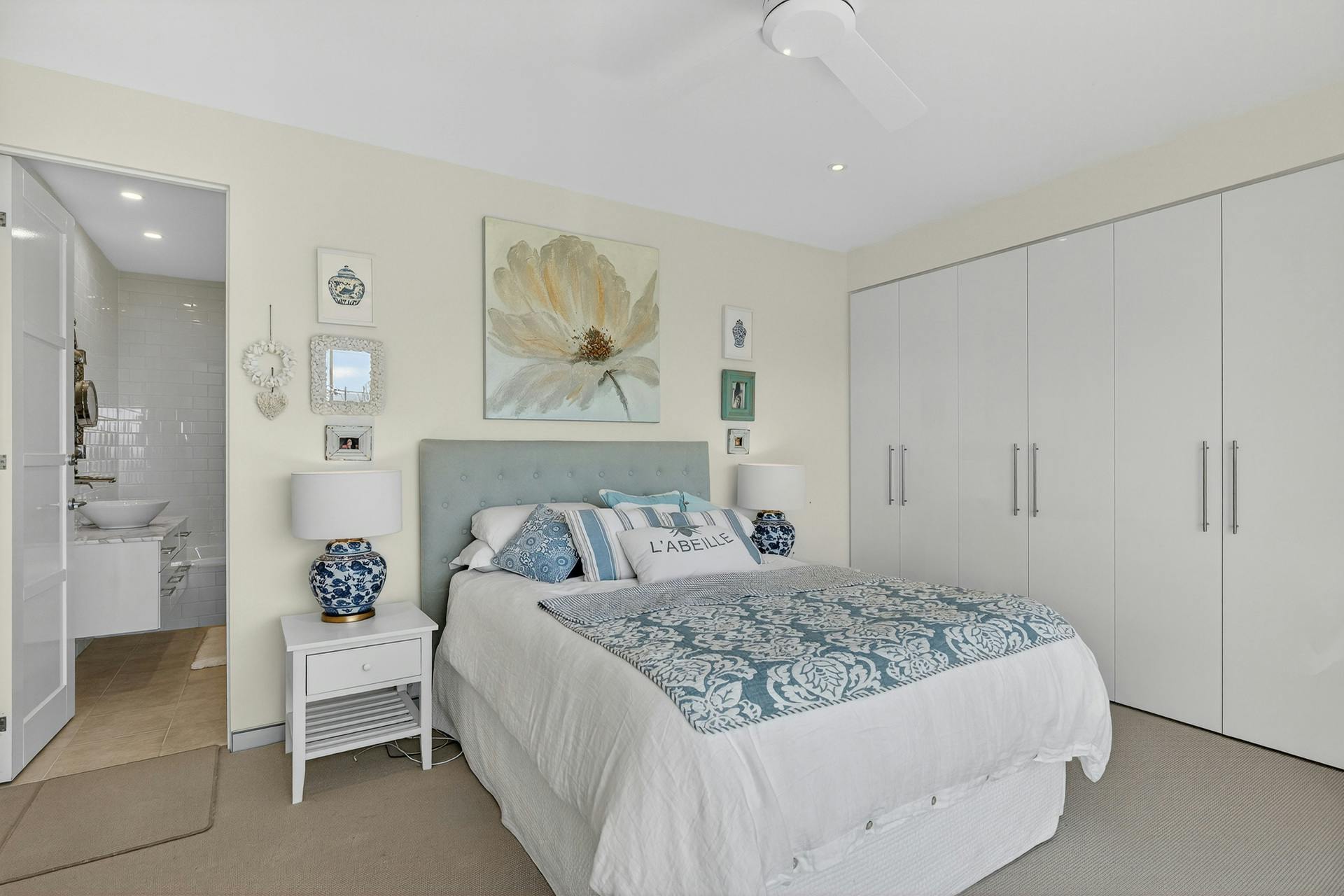 The master bedroom flows off the living space and shares the same spectacular sea and sunset views. A generous ensuite includes both a deep bath and separate shower. The bedroom itself ticks every box with built-in robes, air conditioning, high ceilings with fan, double-glazed feature window, and a beautifully finished, luxurious feel.