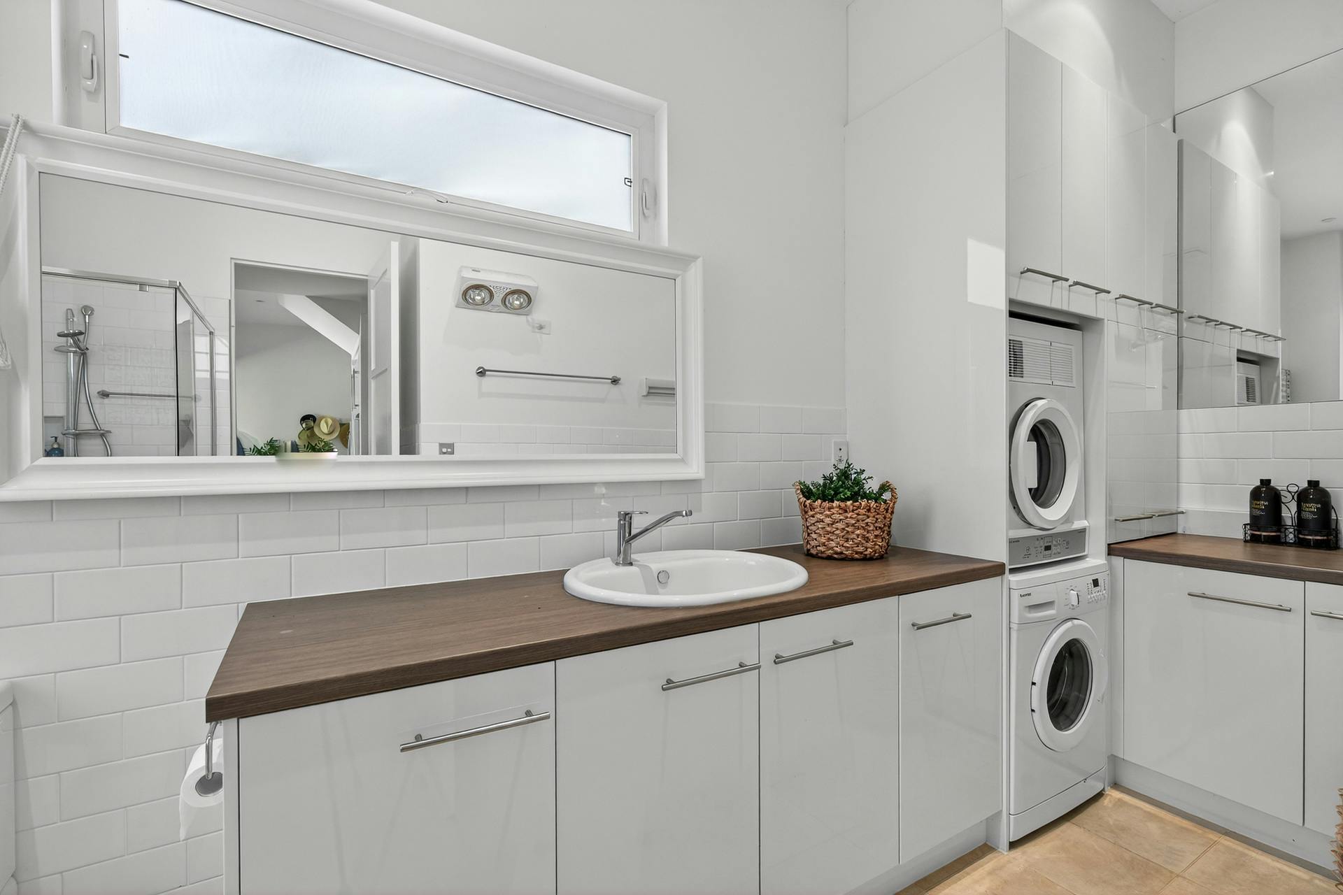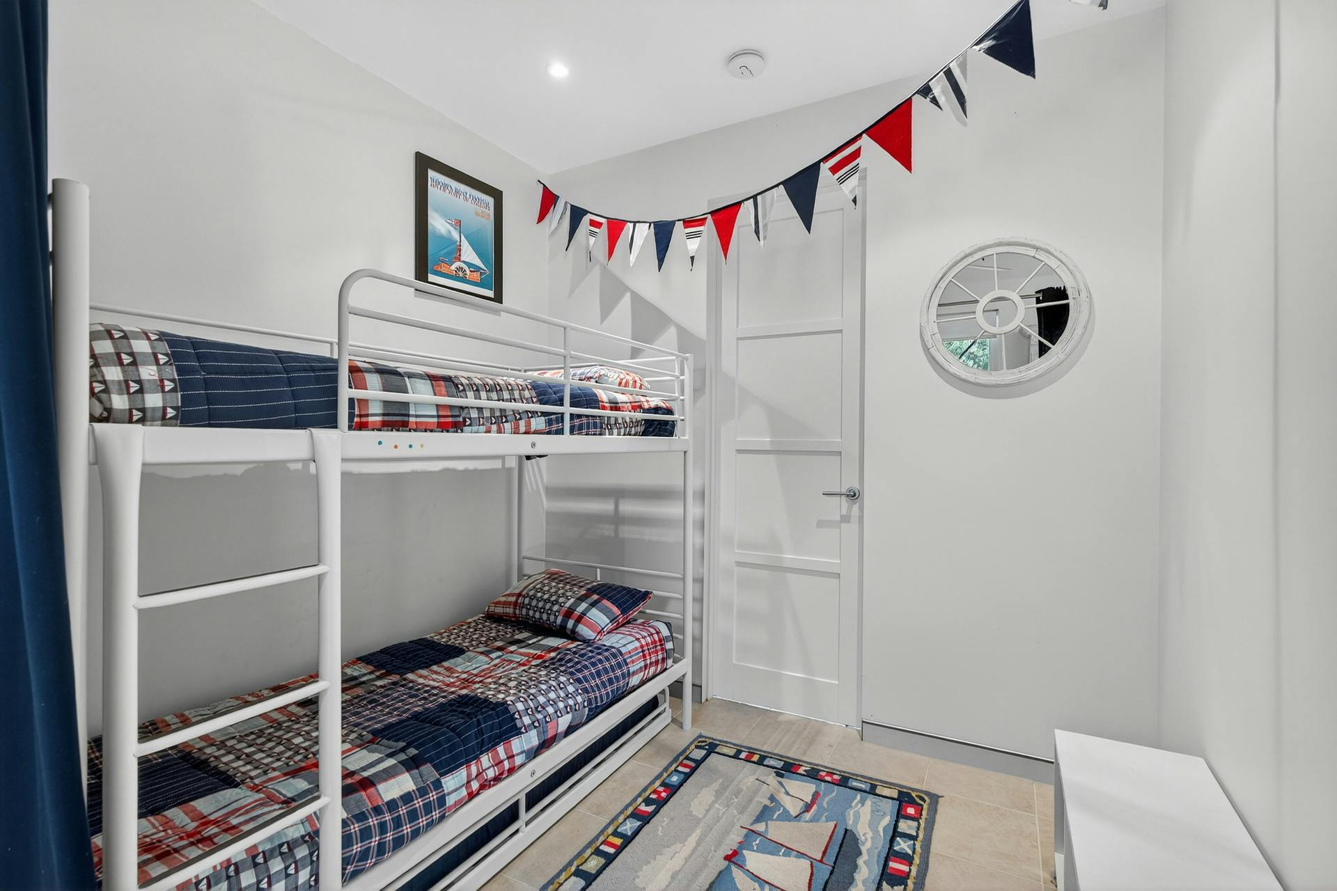 Upon entering, you are greeted by double oversized front doors leading into an open foyer that offers a glimpse of the shimmering blue pool in the background. A stacked-stone pillar and stylish staircase intertwine beneath a stunning modern chandelier, beckoning you upstairs. To your left is a convenient grocery hatch direct from the garage, while to your right is downstairs Bedroom One. High ceilings, large windows, and on-trend décor set the tone. A lush tropical-style garden provides privacy from the street, and features include built-in wardrobes, split system air-conditioning in each room, and ceiling fans for complete comfort. The adjoining bunk room or potential study leads through to the bathroom and laundry, finished with high-end fixtures - quality is the standard here.