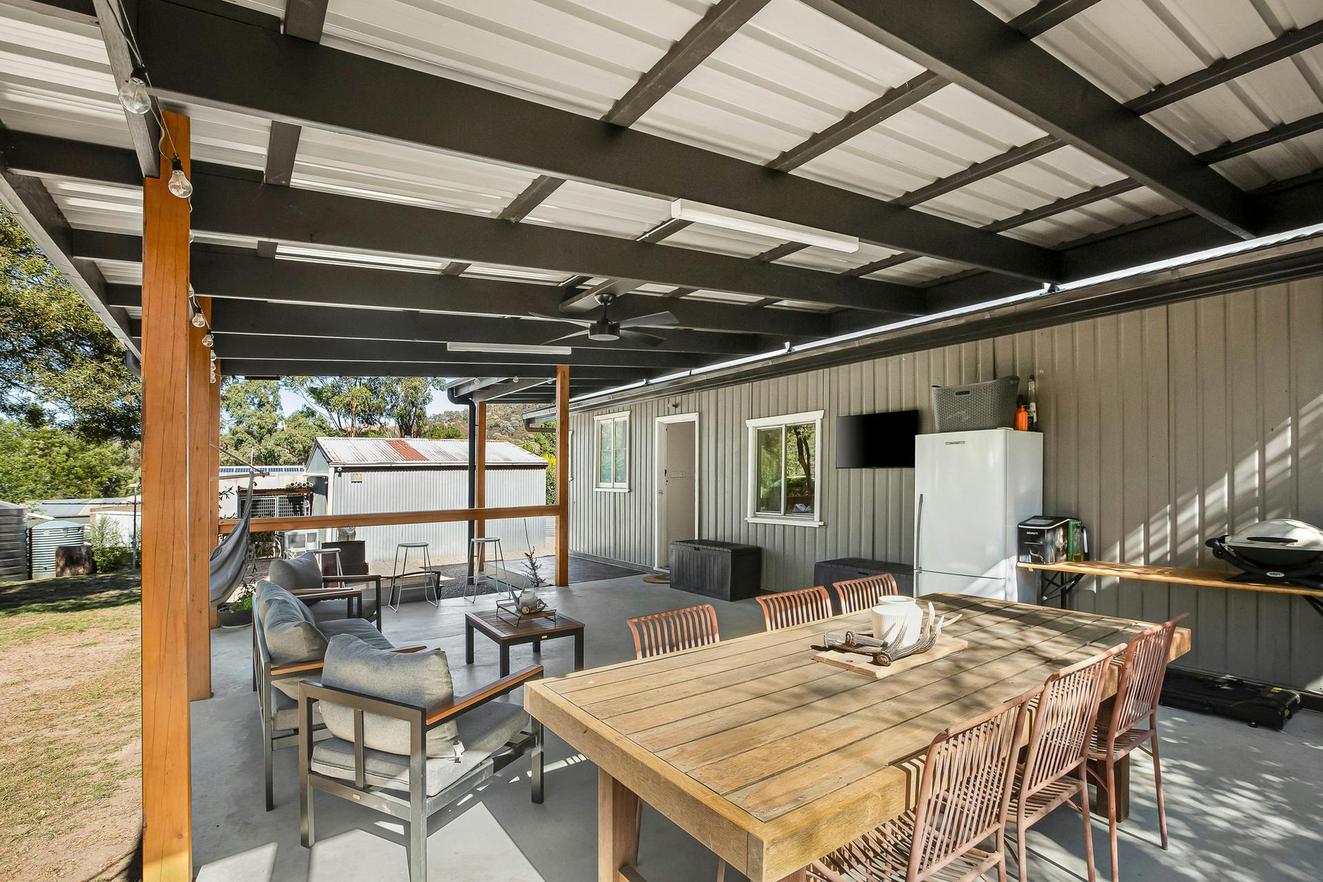 Step inside to a cosy open plan kitchen and living area, where a crackling wood fire sets the scene for winter nights and relaxed year-round comfort. The cleverly combined bathroom and laundry maximise functionality, while the home flows seamlessly onto an expansive covered deck, creating the ultimate space for morning coffees, long lunches, or evenings spent entertaining under the stars.
