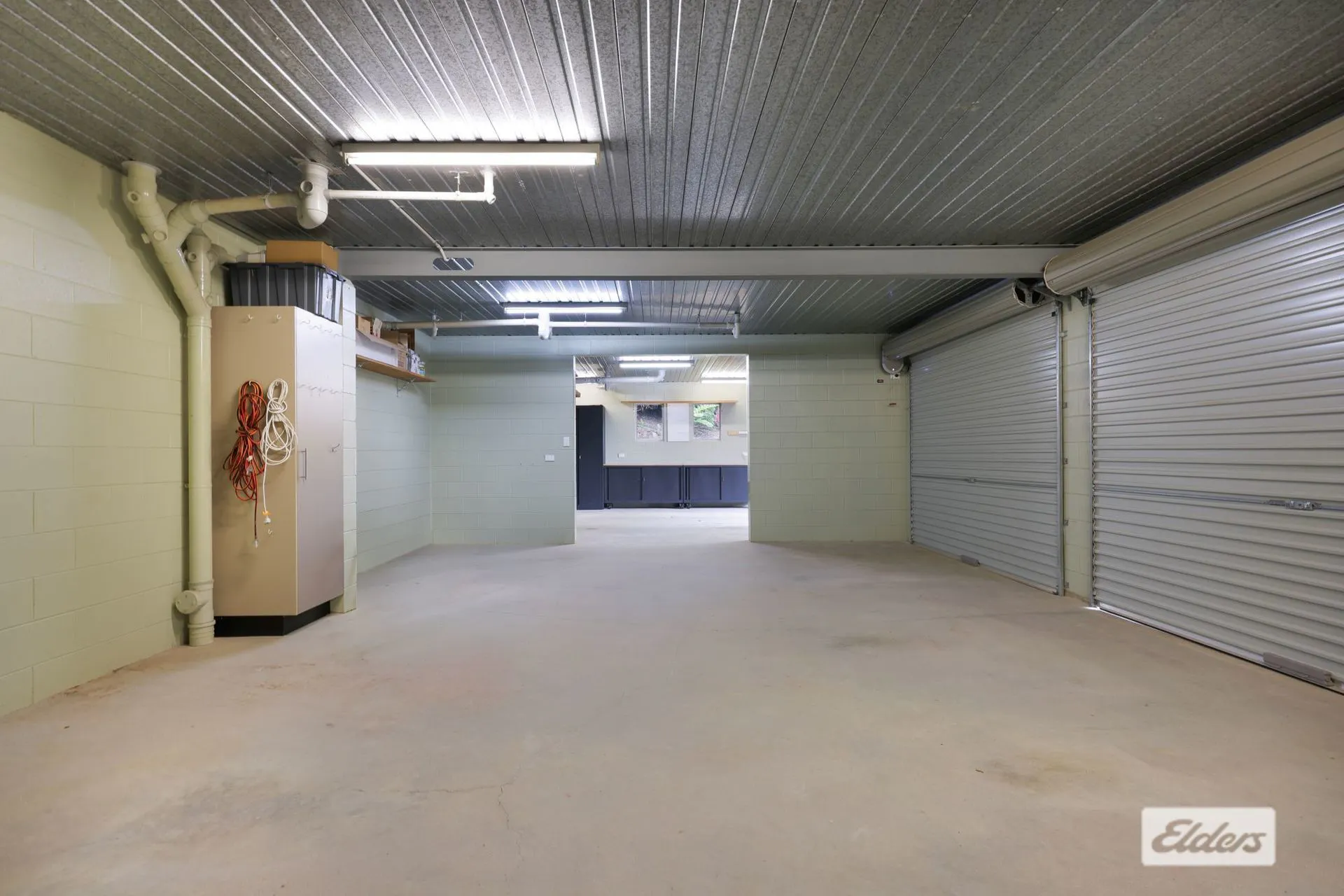 - Three-bay garage with workshop space and additional roller door access