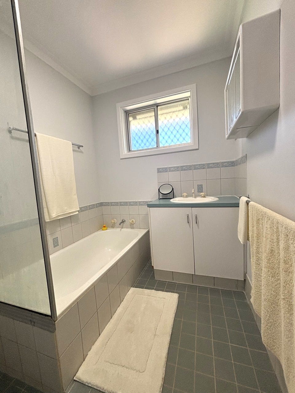 - Tiled bathroom with bath, corner shower and vanity