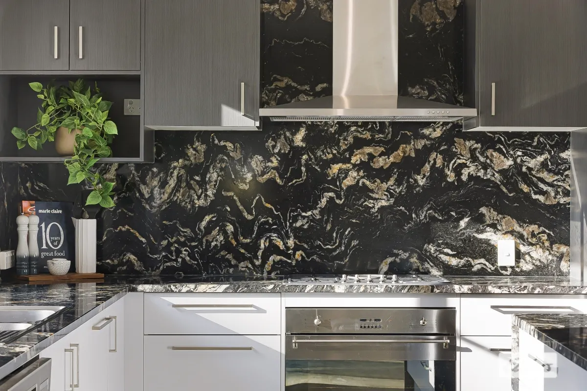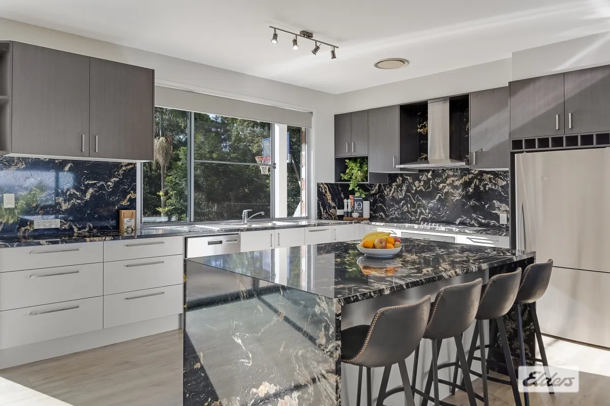 • Designer kitchen features Black Forest Gold bench tops and splash backs, 700mm Smeg gas cook top and oven, Asko D/W, and 1.2m wide island bench with breakfast bar