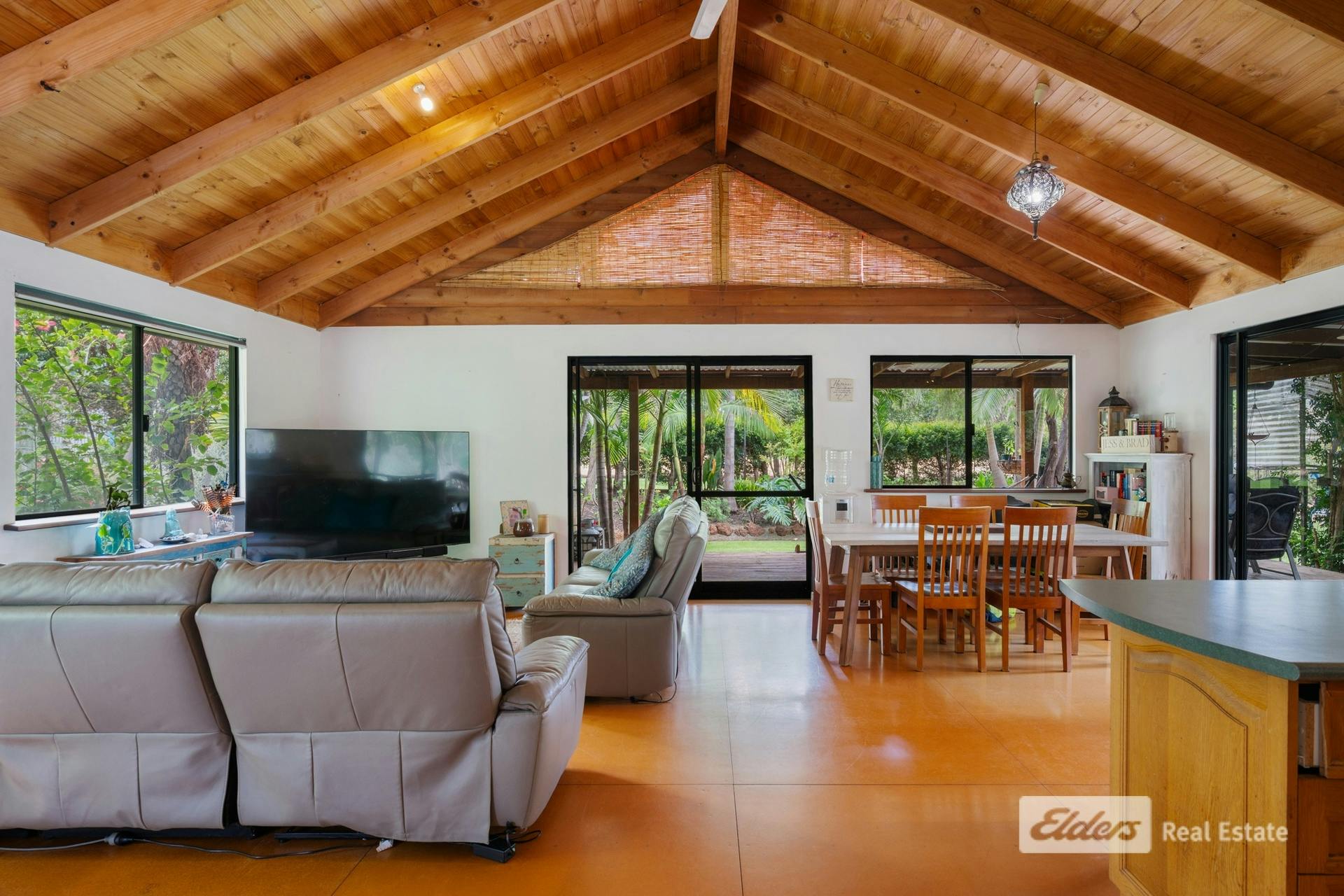 Large windows frame the lovely garden outlook, bringing the beauty of the outdoors inside and creating a calm, relaxing atmosphere throughout the living space.