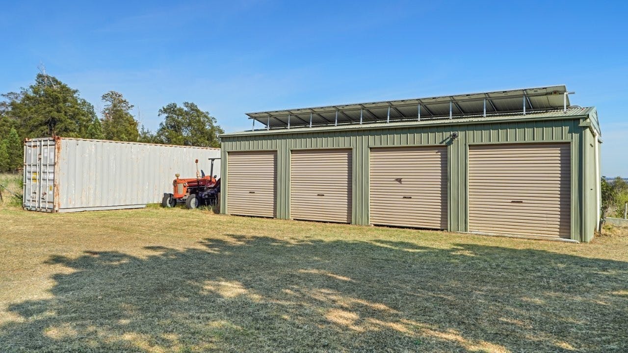 • Fully enclosed 4-bay shed with roller doors, concrete flooring in one bay, and power connected