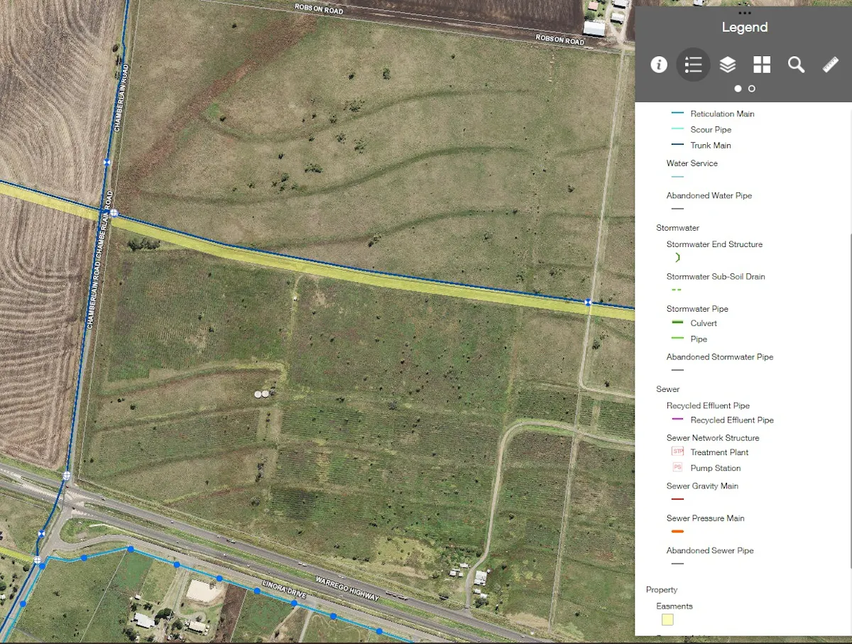 An easement corridor traverses across the centre of the property from East to West, accommodating a Toowoomba Regional Council Water Tunk Main Line, and two other Industry Pipelines.