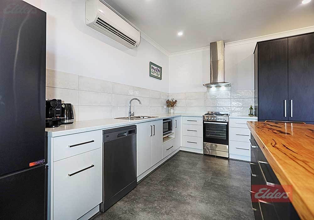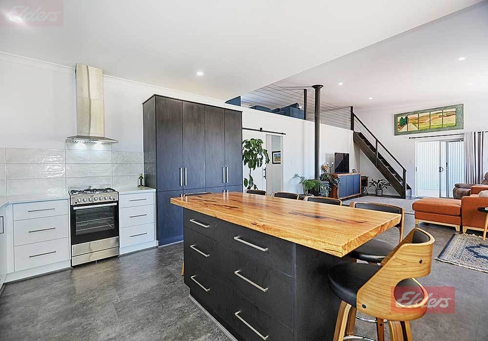 Gorgeous kitchen with bespoke feature timber island bench, ample cupboard and workspace, dishwasher, built in pantry and freestanding stainless-steel oven