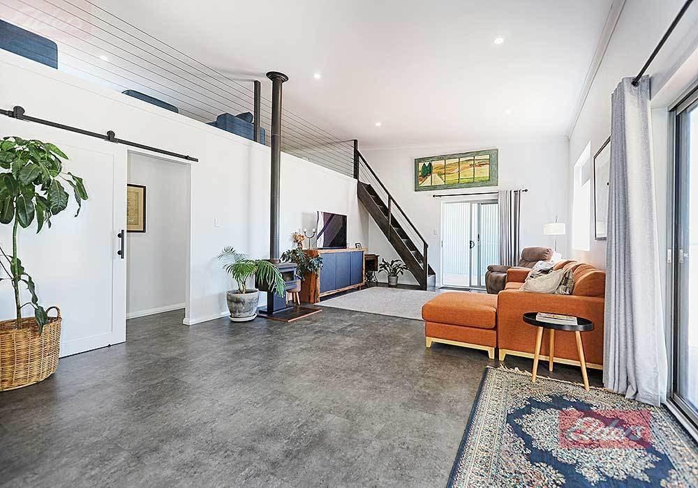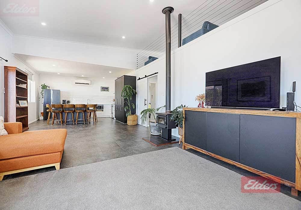 Lofty open‑plan living with raked ceilings, cosy tile fire and reverse cycle split‑system A/C