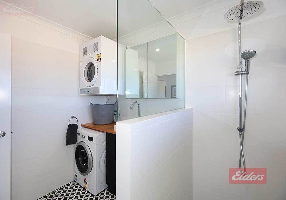 Farmhouse style bathroom /laundry with walk in hob less rain shower and separate WC