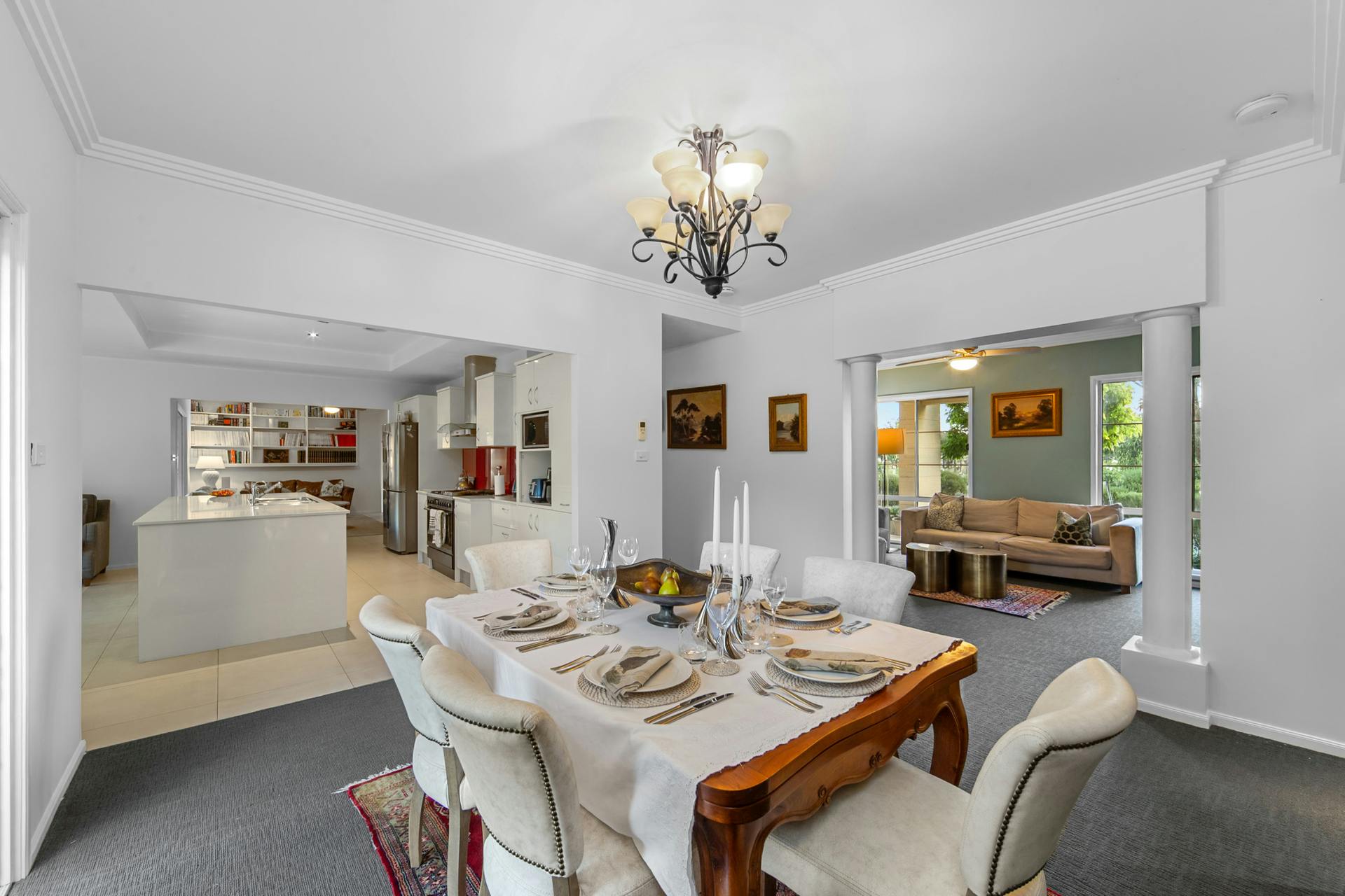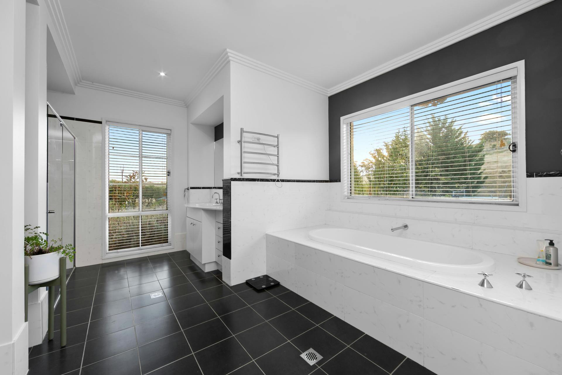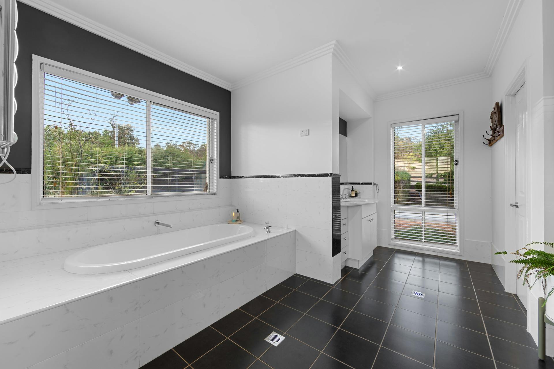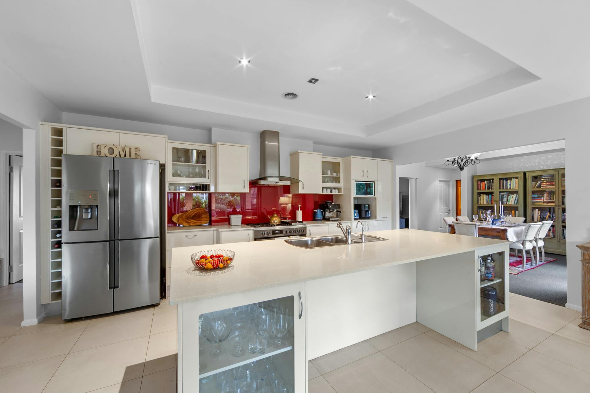 The superbly practical kitchen features an up-market array of high level inclusions and appointments that include 40mm waterfall stone bench tops, Meile appliances and a coffee machine to barista-up your deep, rich Sunday morning crema topped short black.