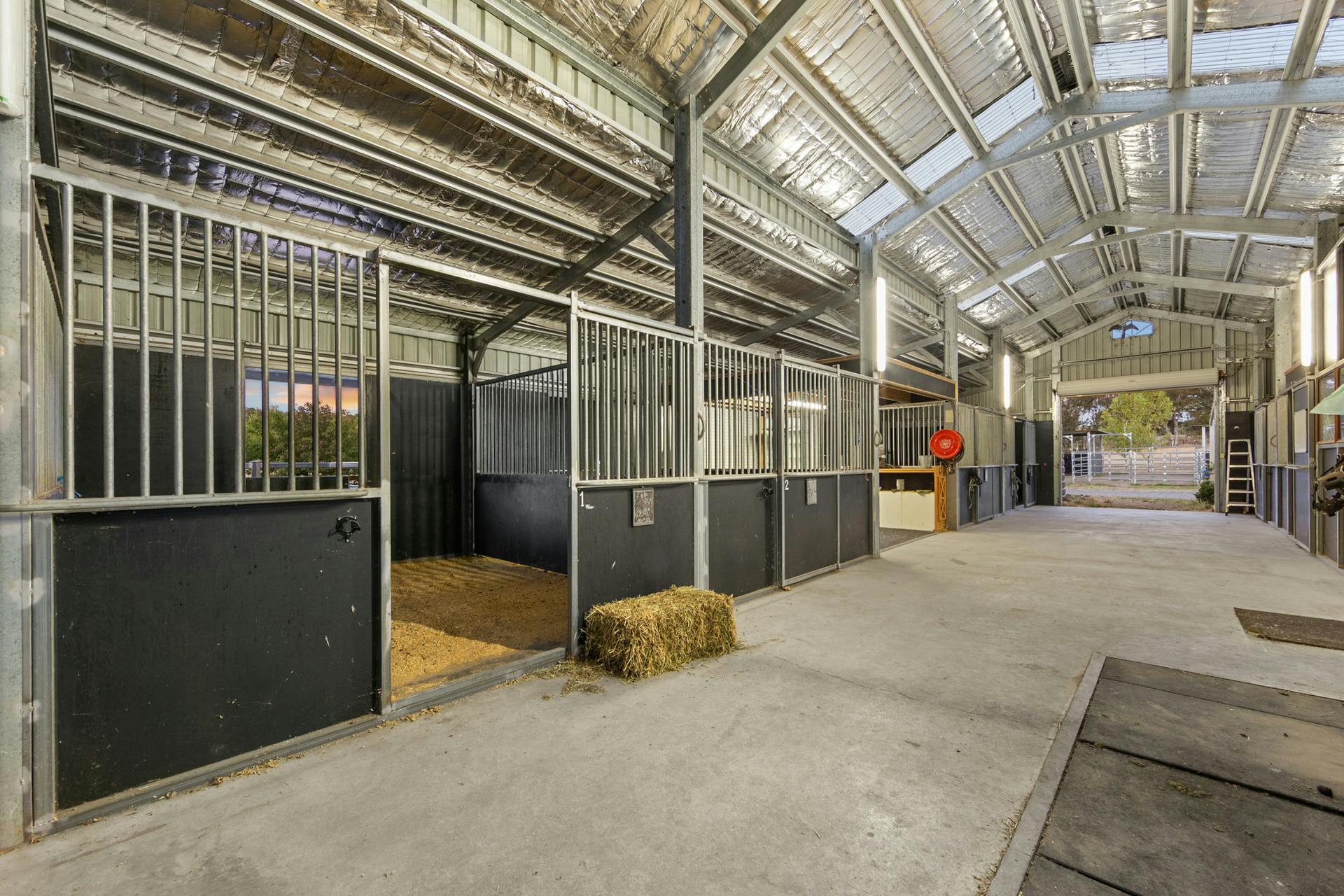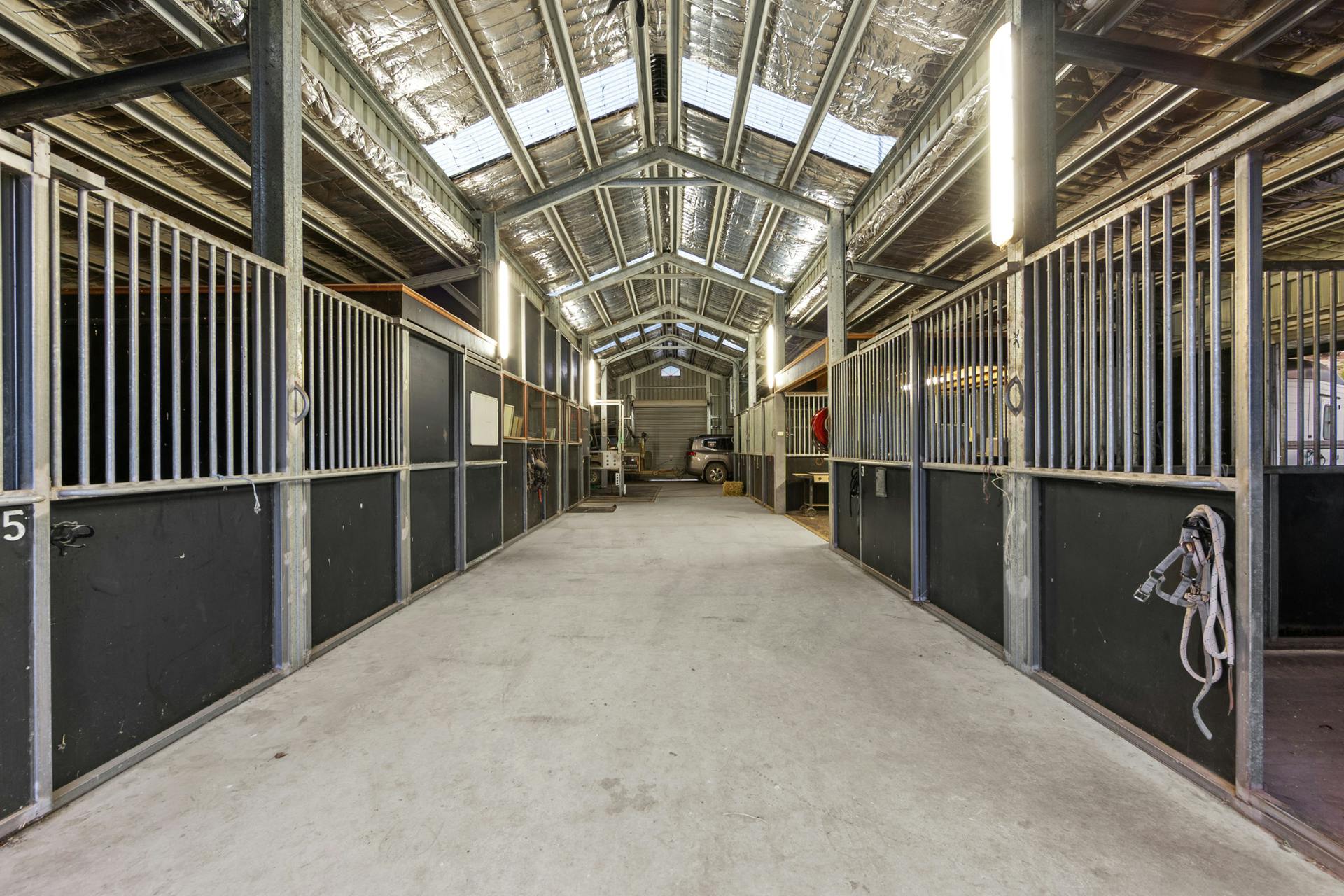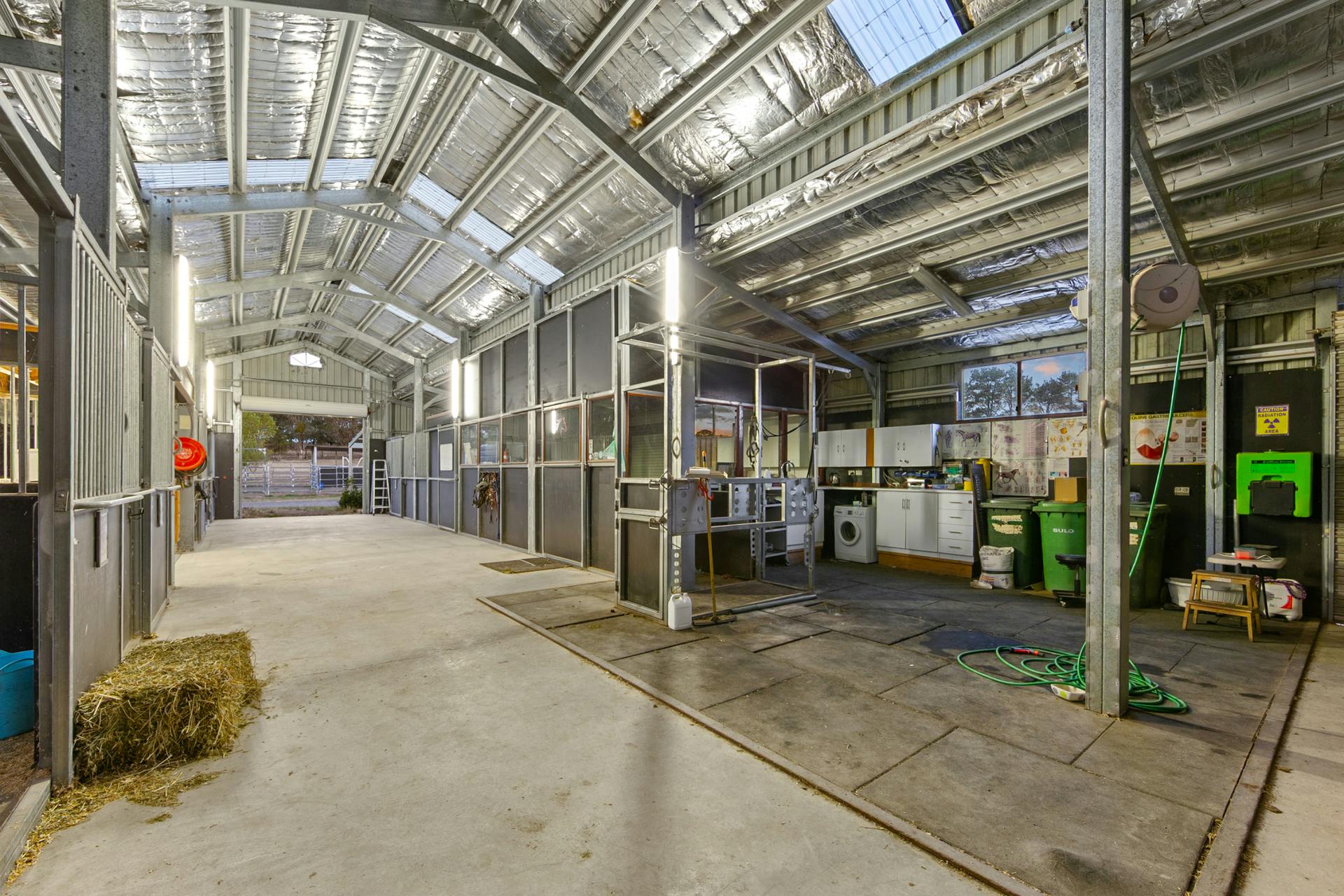 • Main Stables – 412m2 under roof – currently leased as an equine veterinary clinic- accessed via separate entrance off Glengyle Rd.- steel construction with brushed concrete 6m wide breezeway & work areas- box configuration/details