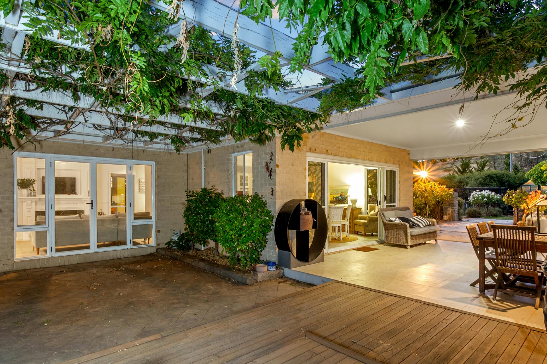 • Gardens:- Professionally designed creative mix of lawns, geometrically aligned pathways & effervescent garden beds containing many varieties of plants, stone ornamental features & timber fences, productive fruit trees, David Austin & Olde World roses- 2 main pergola areas/outdoor living areas & individual timber decks- fenced household vegetable/herb gardens, green house, enclosed chook run, dog run- gravity fed water from a 10,000lt elevated dam water header tank