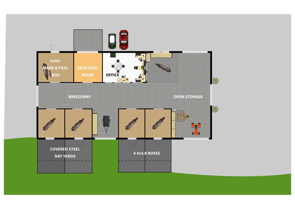 four 3.8m x 4m boxes with attached (75% roofed) steel post/rail fenced day yards one 5m x 4m mare & foal box all boxes have soft (Stable Comfort) floors, sliding access doors, removable divider walls & auto drinkers- secure office (including a floor mounted safe) with RCAC & built-in storage- toilet/WC outbuilding with bio-septic system- large main tack room with 8 saddle mounts, swing rug racks & mezzanine storage- large safe work area with (SoftFall) flooring, custom designed crush & associated foal box suitable for all sizes of horse- electric over-height access doors – direct float/truck access & parking- 33,000lt rainwater tank, rodent proof feed bins