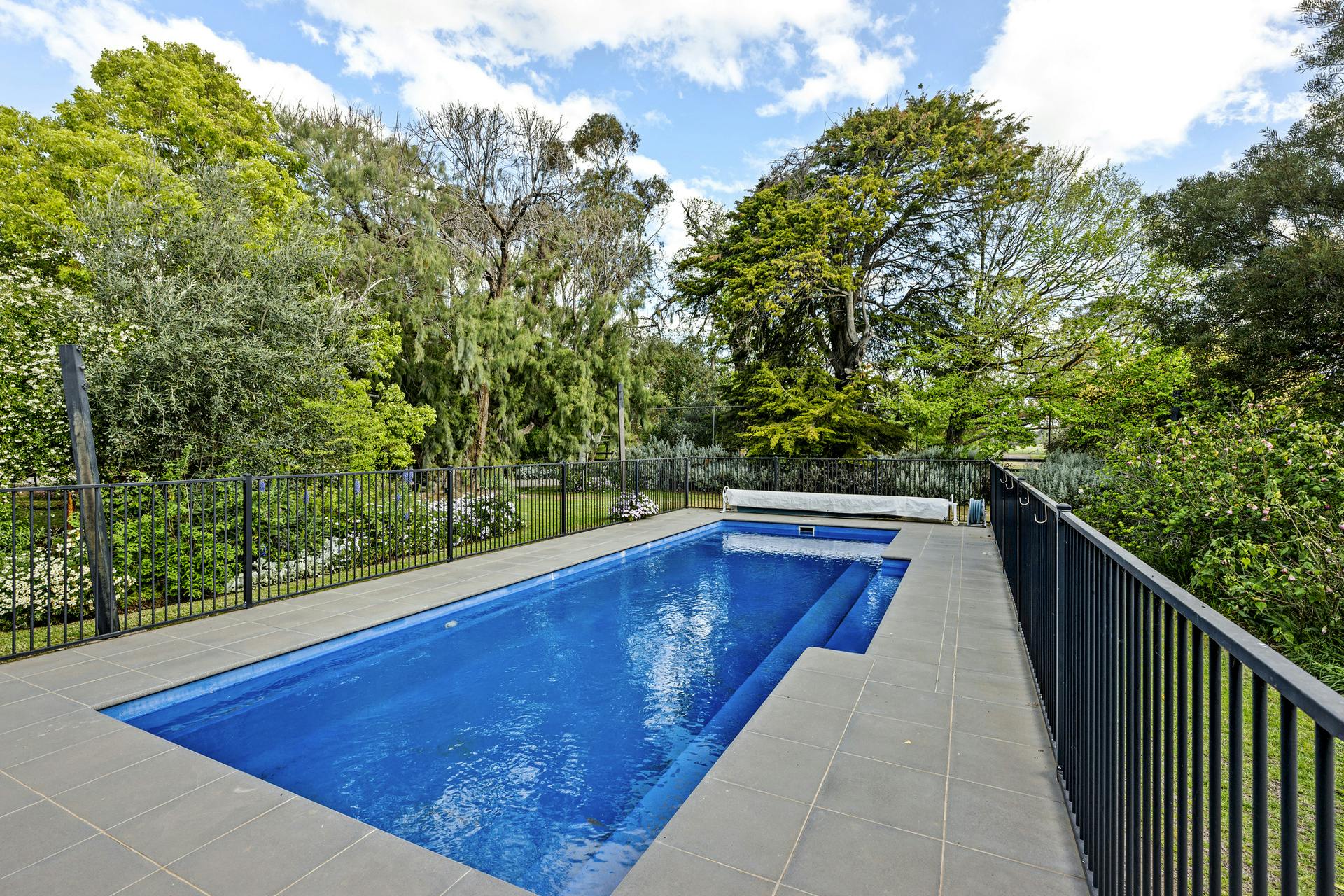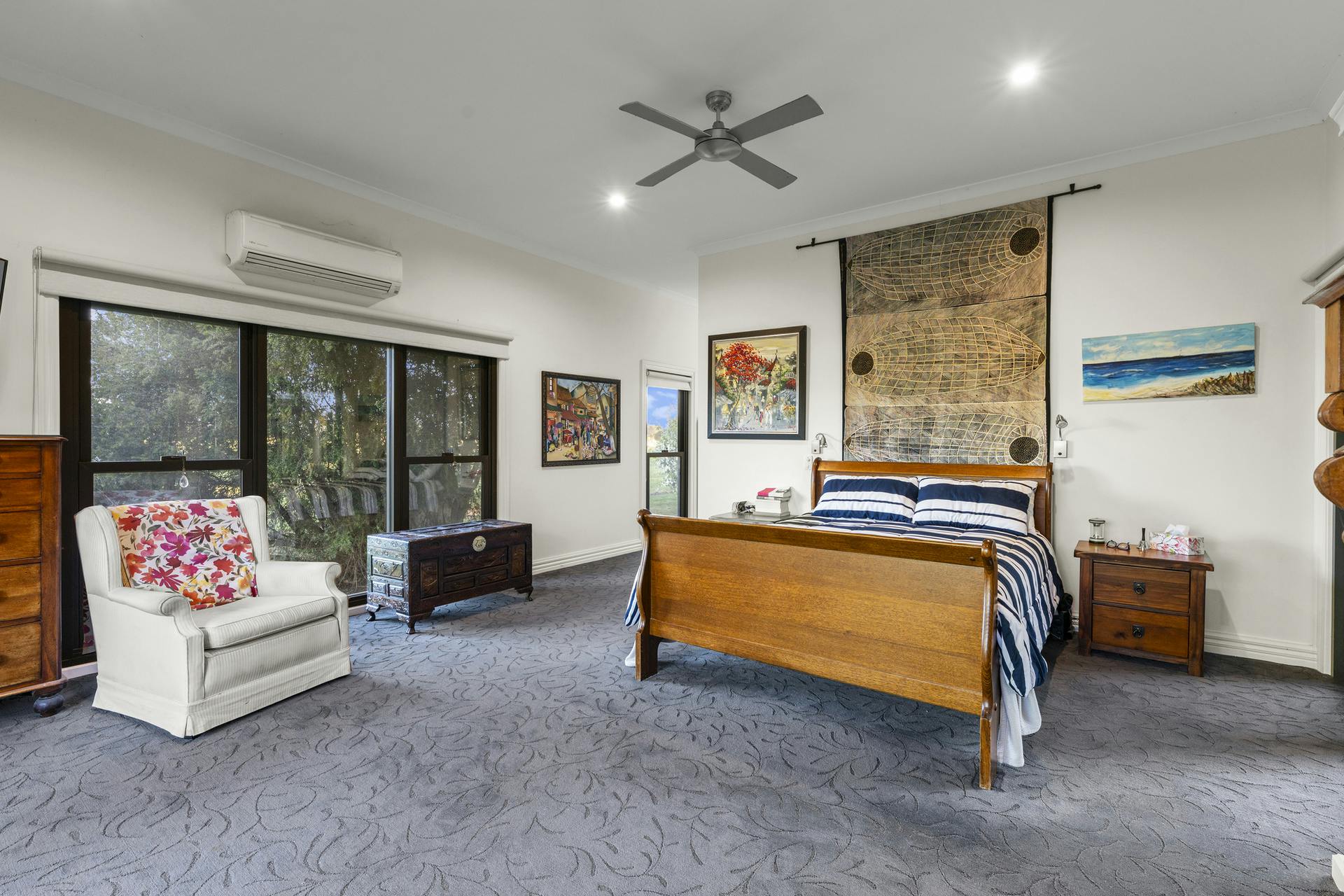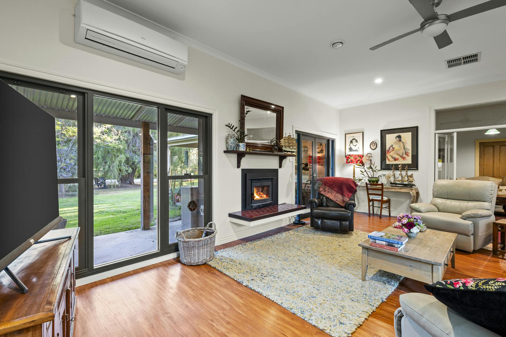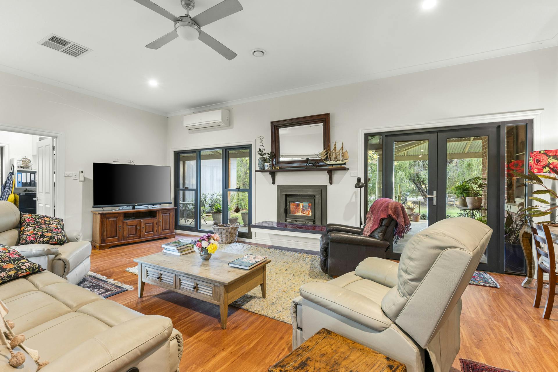 Living spaces are light-filled and functional: a large living room with open fireplace flows to dining and the kitchen, balanced by a separate sitting room for quieter retreat. Broad sliders step out to an oversized undercover alfresco for effortless entertaining. Everyday practicality is covered with a dedicated home office, internal store and two external storerooms. Wide verandahs frame the home and link the living zones to the pool, carport and established gardens. High ceilings, period detail, heating/cooling and excellent natural light underpin year-round comfort.