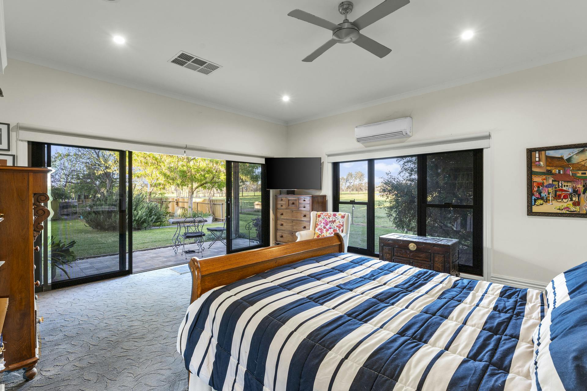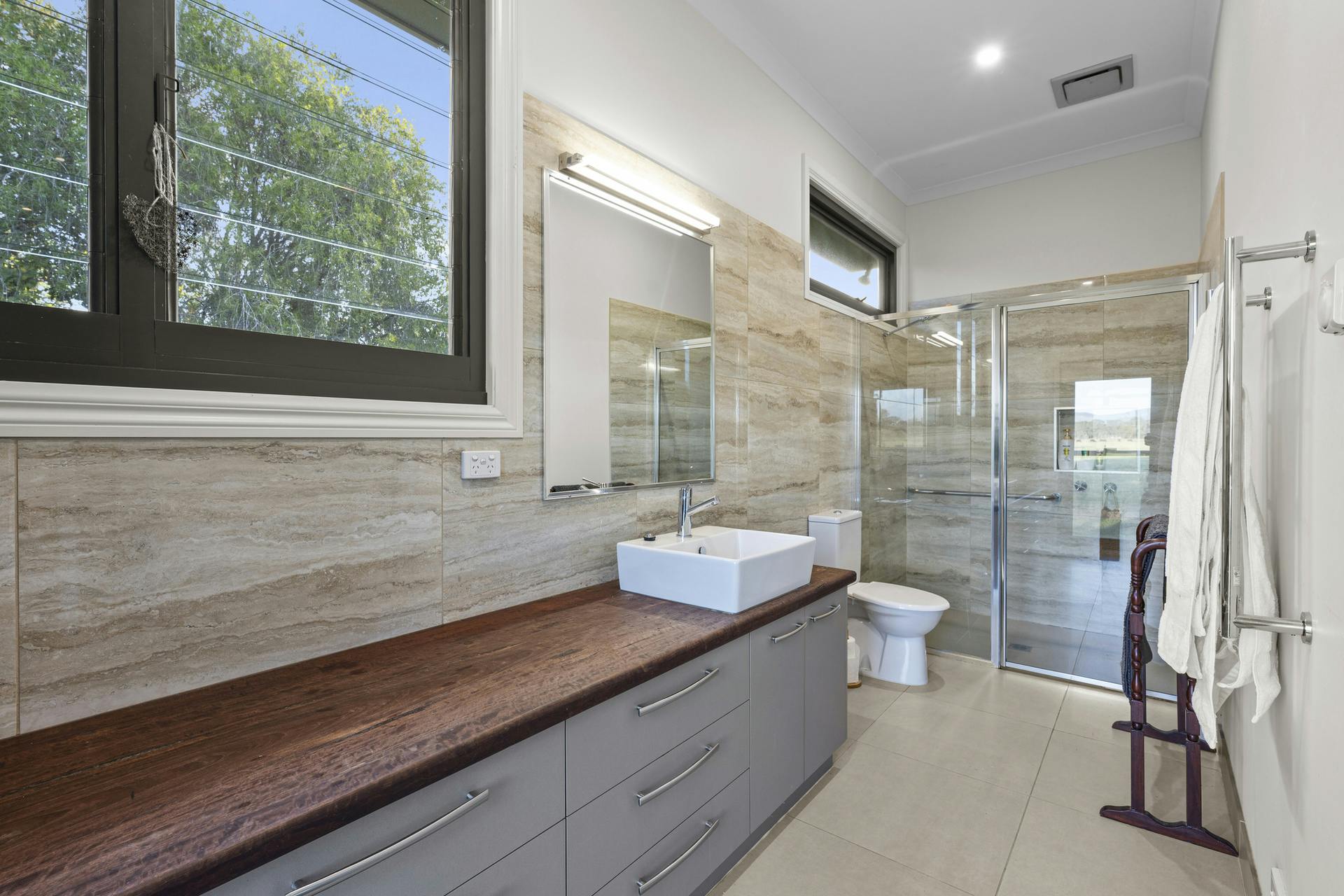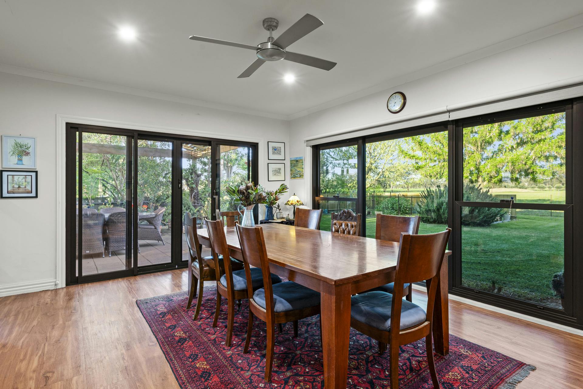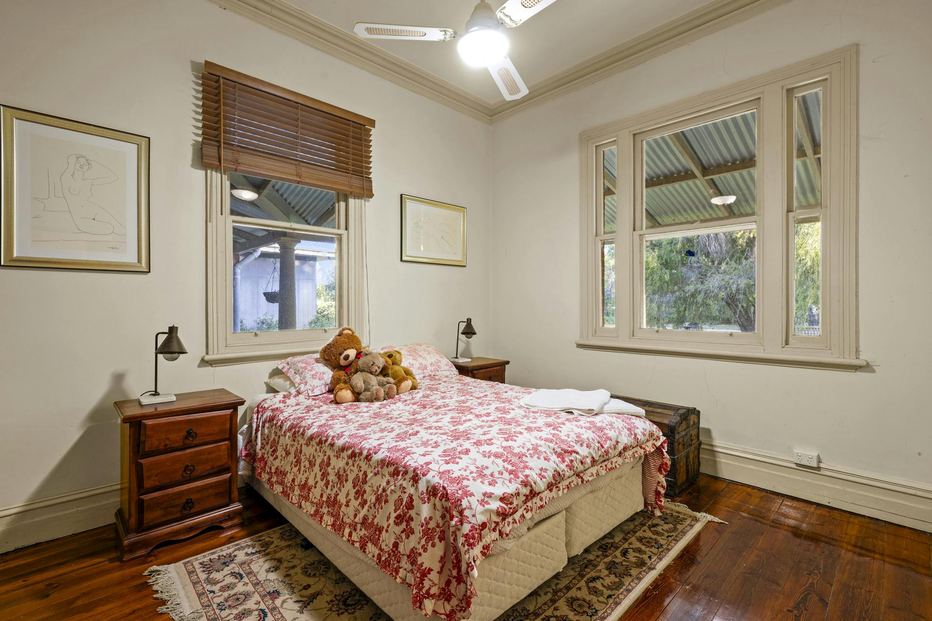 At the heart of Flowerdale Farm is a distinguished c.1904 brick homestead, sensitively extended for generous modern living while preserving its character. A private parents' wing includes a king-scale main bedroom with walk-in robe and ensuite, opening to the verandah and gardens. The separate family/guest wing in the original section of the home groups three well-proportioned bedrooms with built-ins and original fireplaces, serviced by a family bathroom and combined bath/laundry.