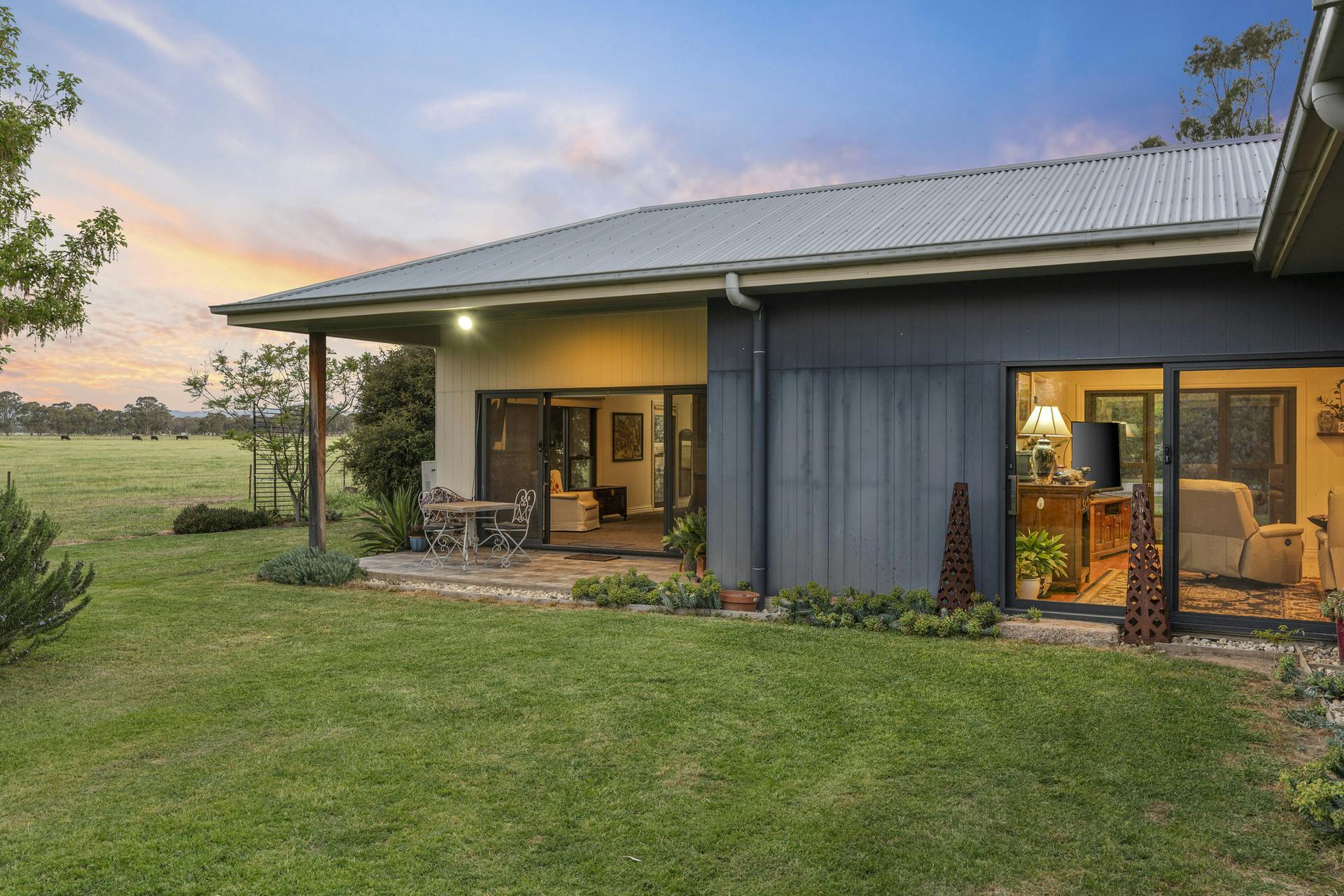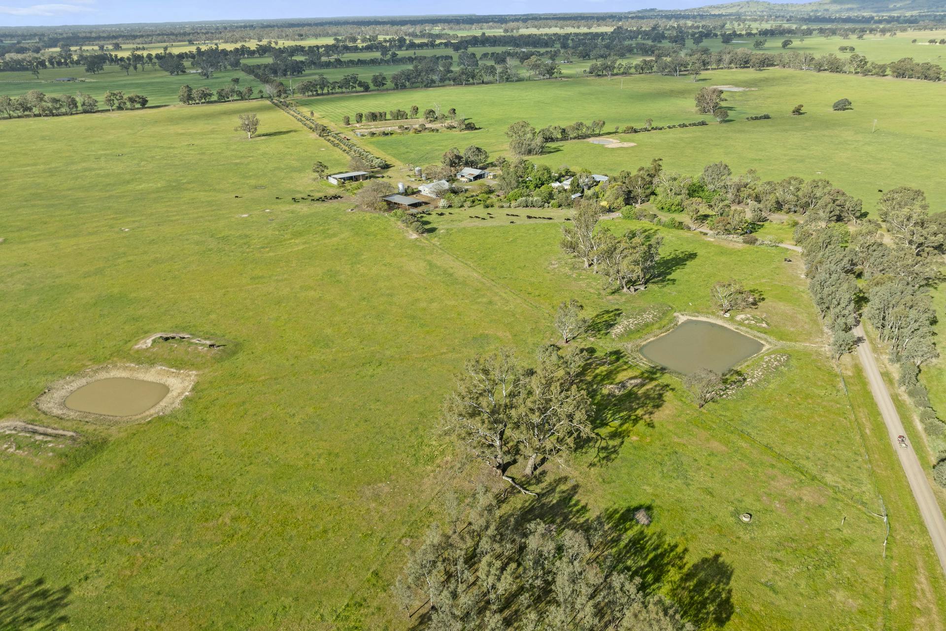 Working improvements include outstanding covered, flood-lit cattle yards with water, extensive machinery and storage shedding and a large hay shed. Catchment dams and troughs provide water to all paddocks with a bore in place as back-up if ever needed. Access is straightforward with frontage to Riggs Creek Road, Old Euroa Road and Balmattum Siding Road, plus dual driveway access to the residence and orderly internal tracks. Overall presentation is neat and well maintained, reflecting careful stewardship and making for an easy takeover.
