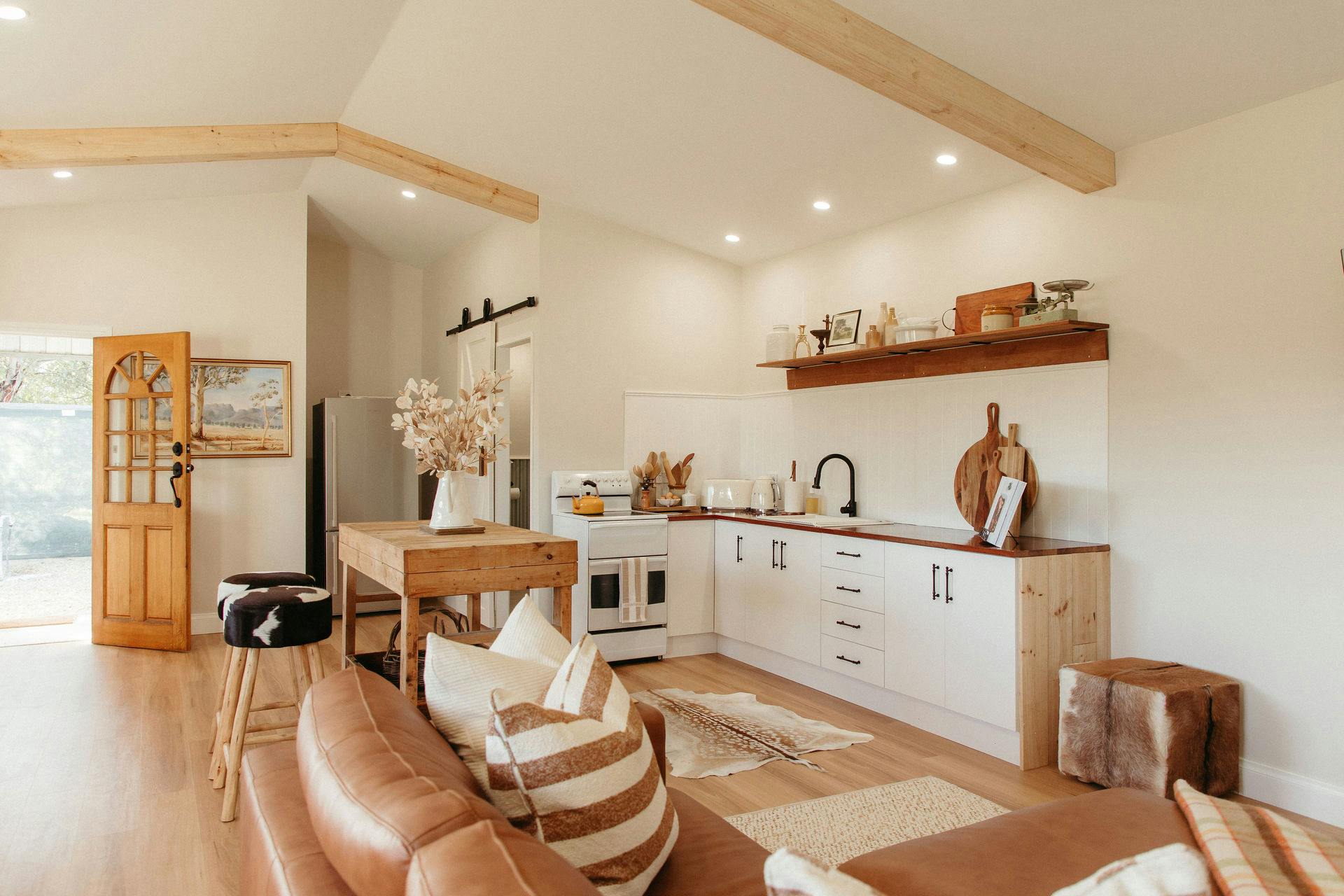 Featuring raked ceilings, floating timber floors, and a welcoming open-plan kitchen, dining, and living area, the home exudes a relaxed country atmosphere.