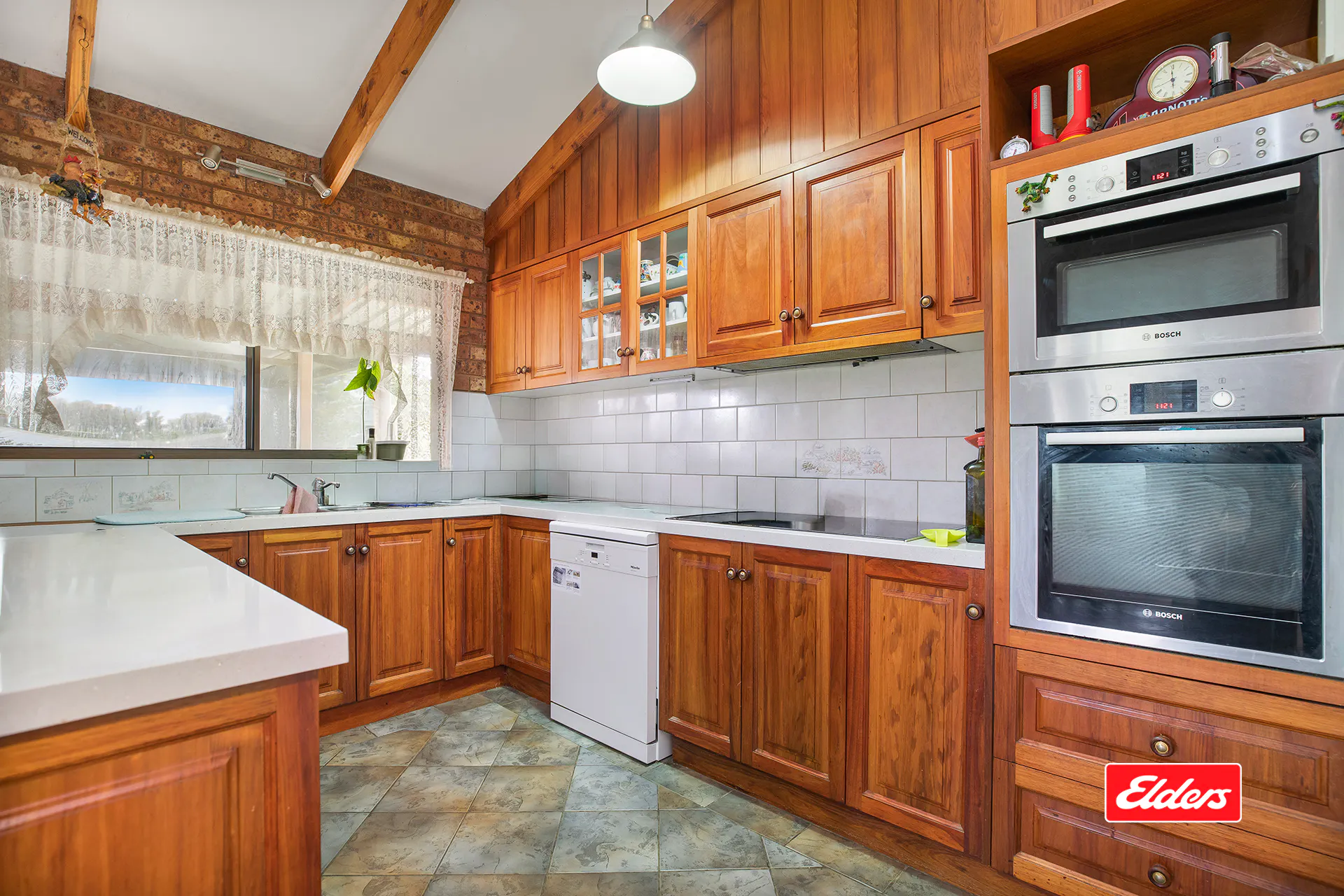 Internally, the home is rich in character with raked ceilings and exposed timber beams, while large windows capture natural light and outlooks across the surrounding property. The kitchen is well appointed with timber cabinetry, double oven and walk-in pantry, and the main bathroom has been updated with modern finishes including bath and separate shower.