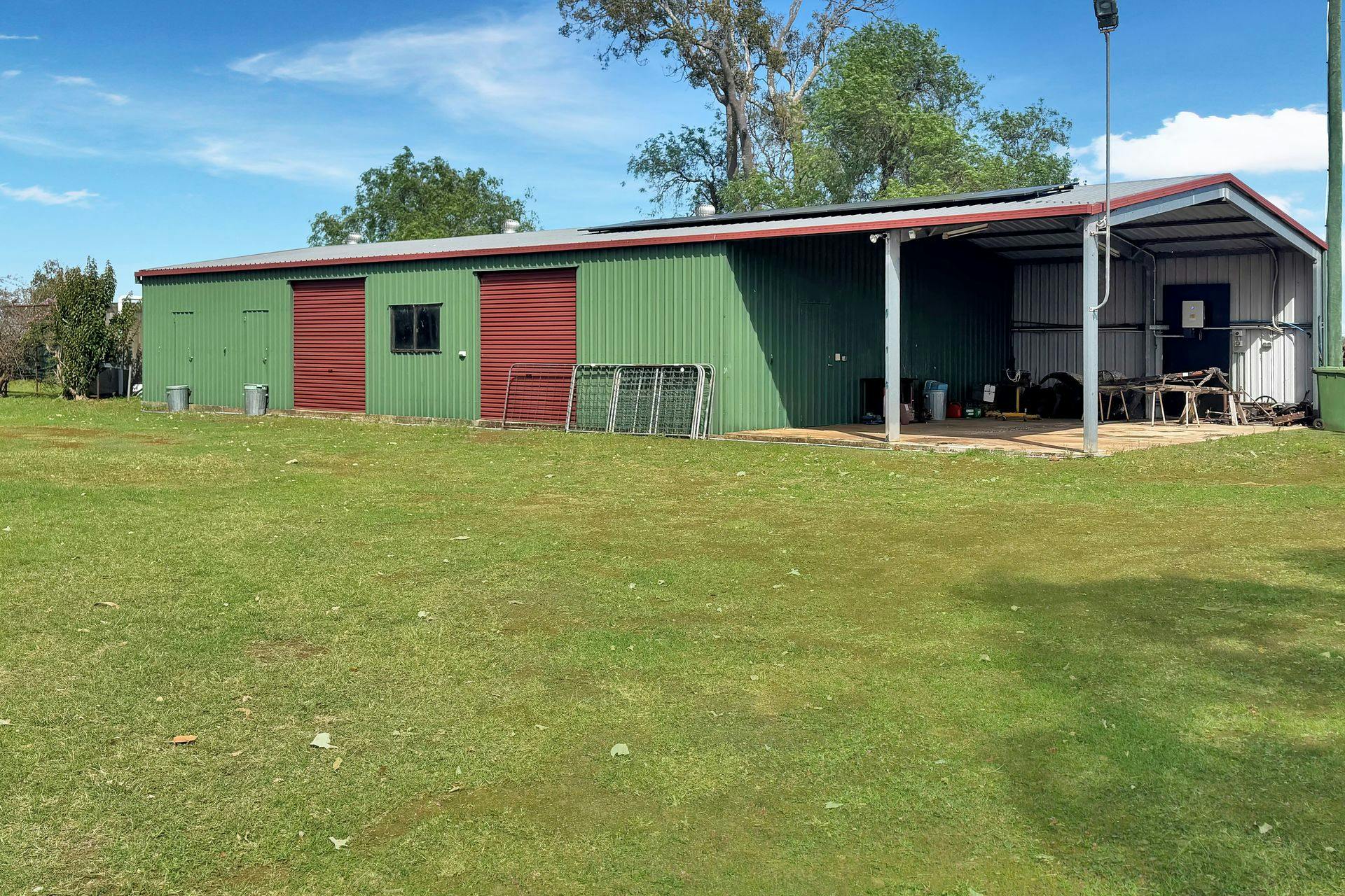A combined machinery and workshop colour bond shed of 24 x 9m plus a 4.2 x 12m rear enclosed annex, combines to provide four separate sections under one big roof. 3 Phase powered and concrete floor throughout.