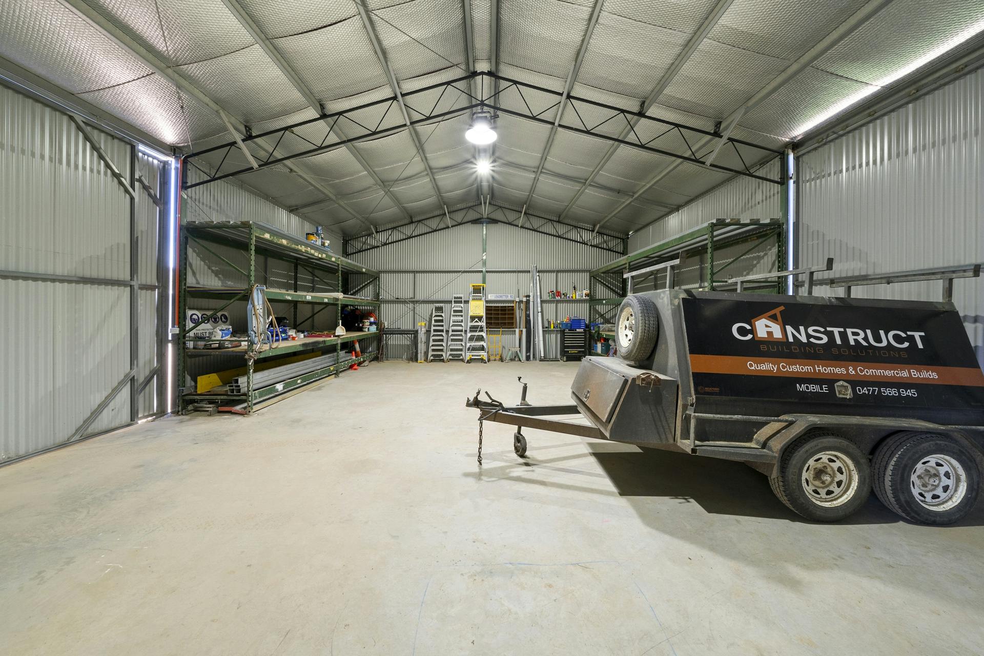 • A high-clearance 18 x 9 metre machinery shed with power, concrete floor and shelving