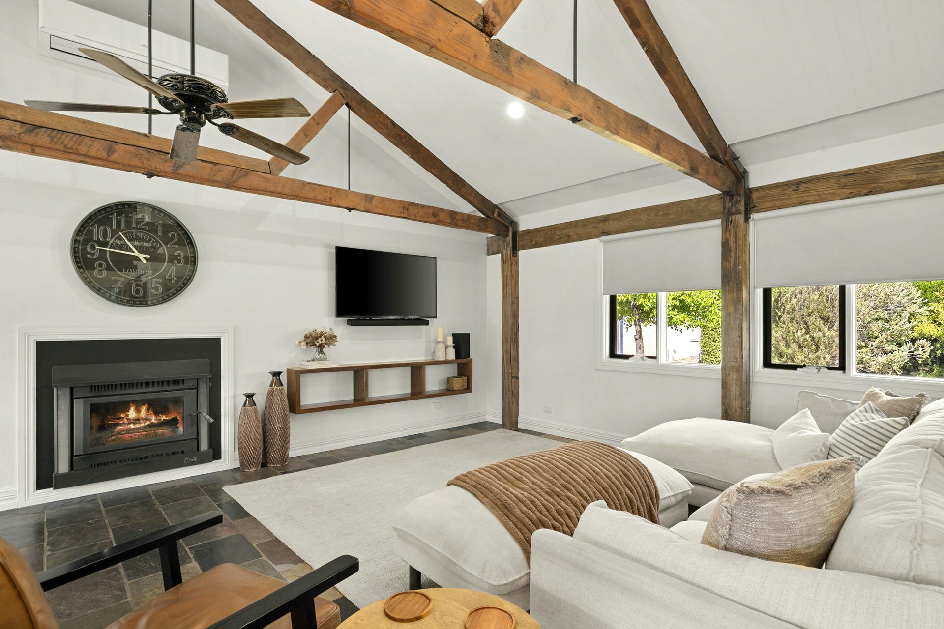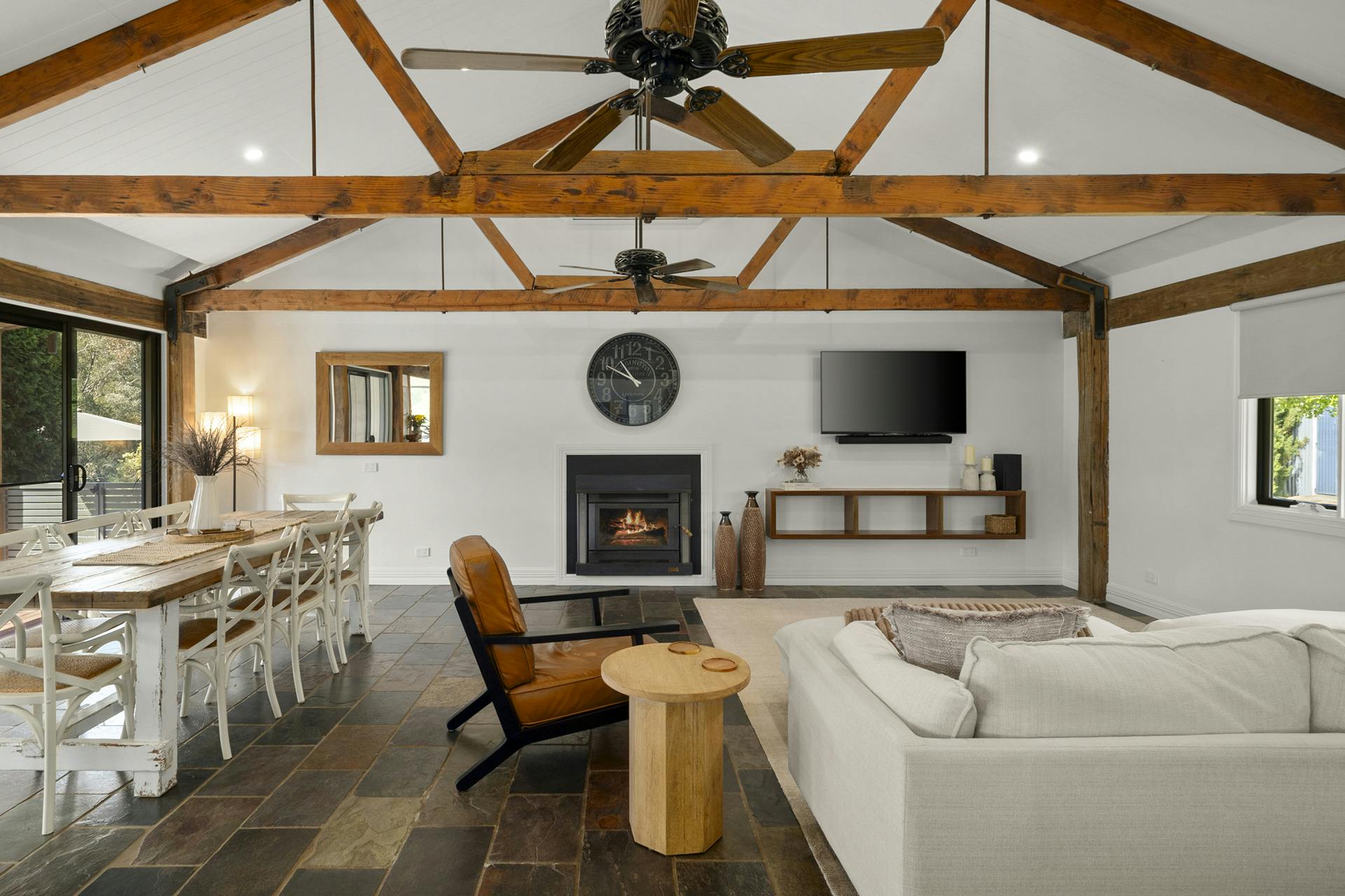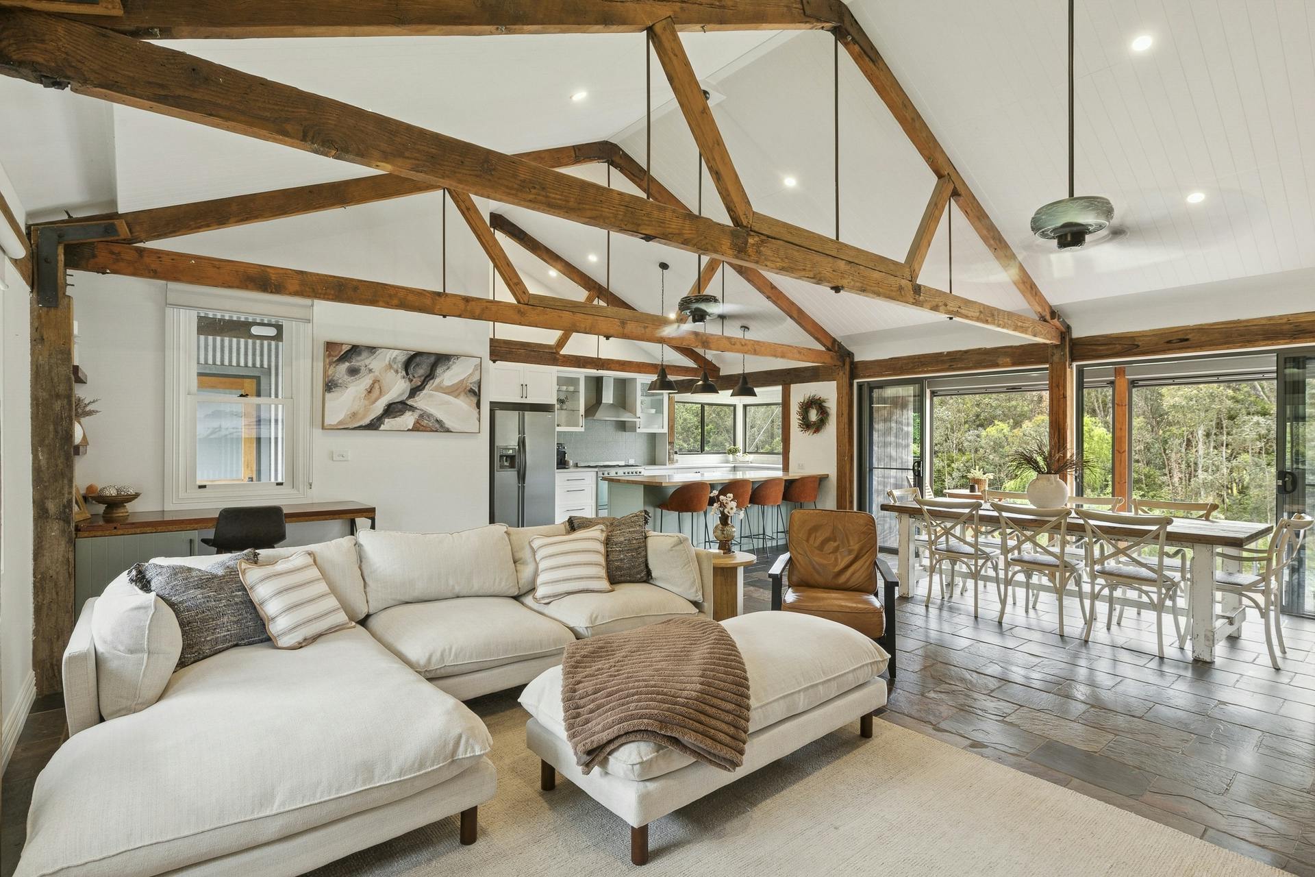 Thoughtfully designed to maximise views and natural light, the beautifully appointed residence invites you to slow down and savour your surroundings, a sense of serenity that feels almost surreal. Vaulted ceilings with exposed trusses frame the generous open-plan living space, while floor-to-ceiling glazing opens onto wide decks overlooking the stunning Fifteen Mile Creek.