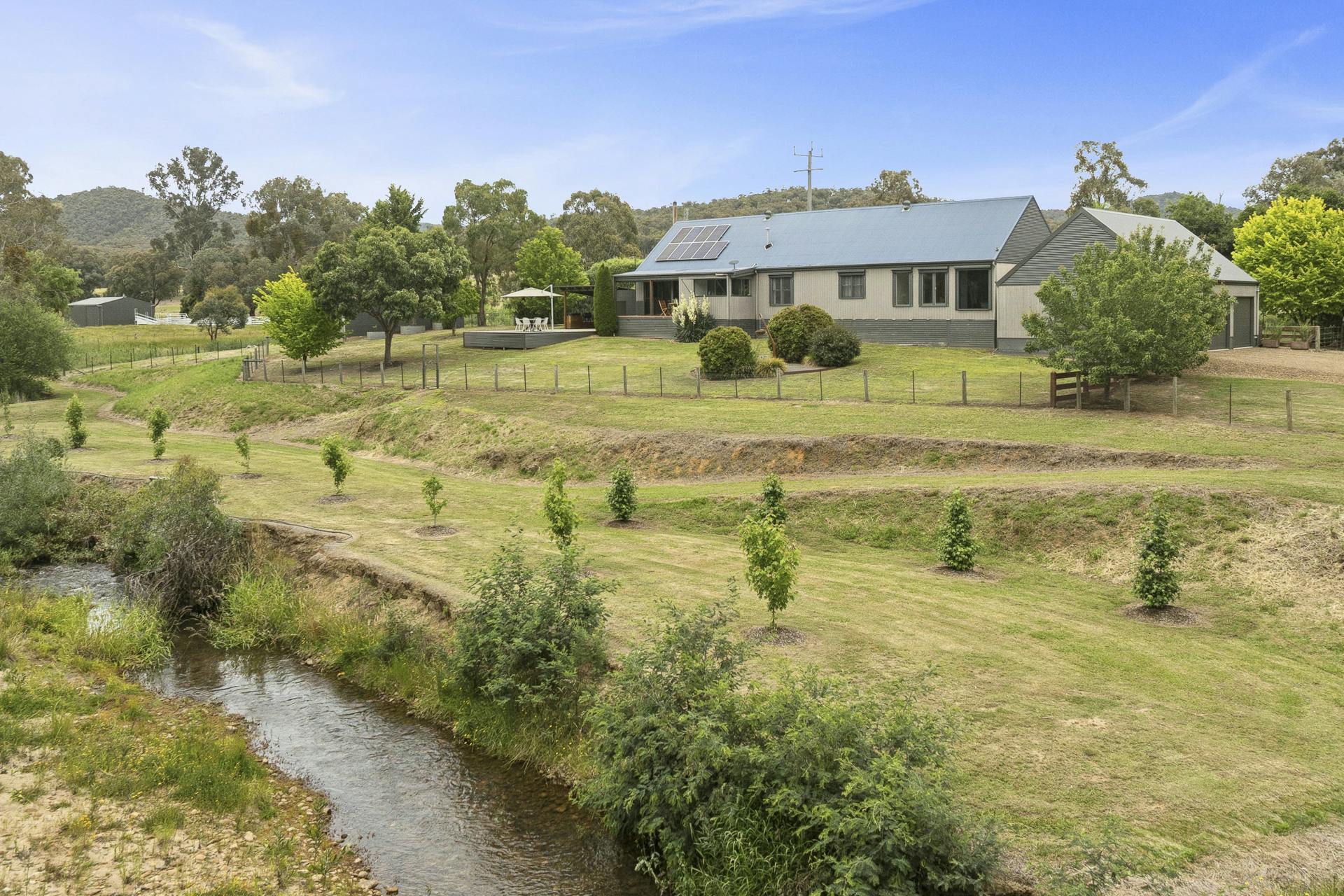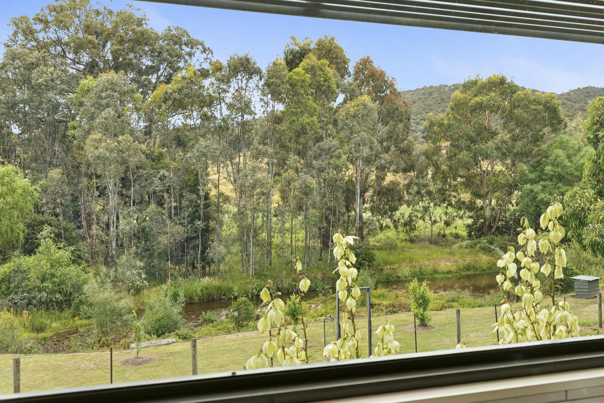The jewel in the crown is the crystal-clear Fifteen Mile Creek that meanders along the boundary, offering direct access to a serene, shaded trout stream bordered by established river gums. The land is gently undulating, securely fenced and thoughtfully landscaped with mature trees and hardy ornamentals, creating an immersive rural environment with year-round visual appeal. Nature is ever-present here; birds, wildlife and the quiet beauty of the landscape form part of daily life.