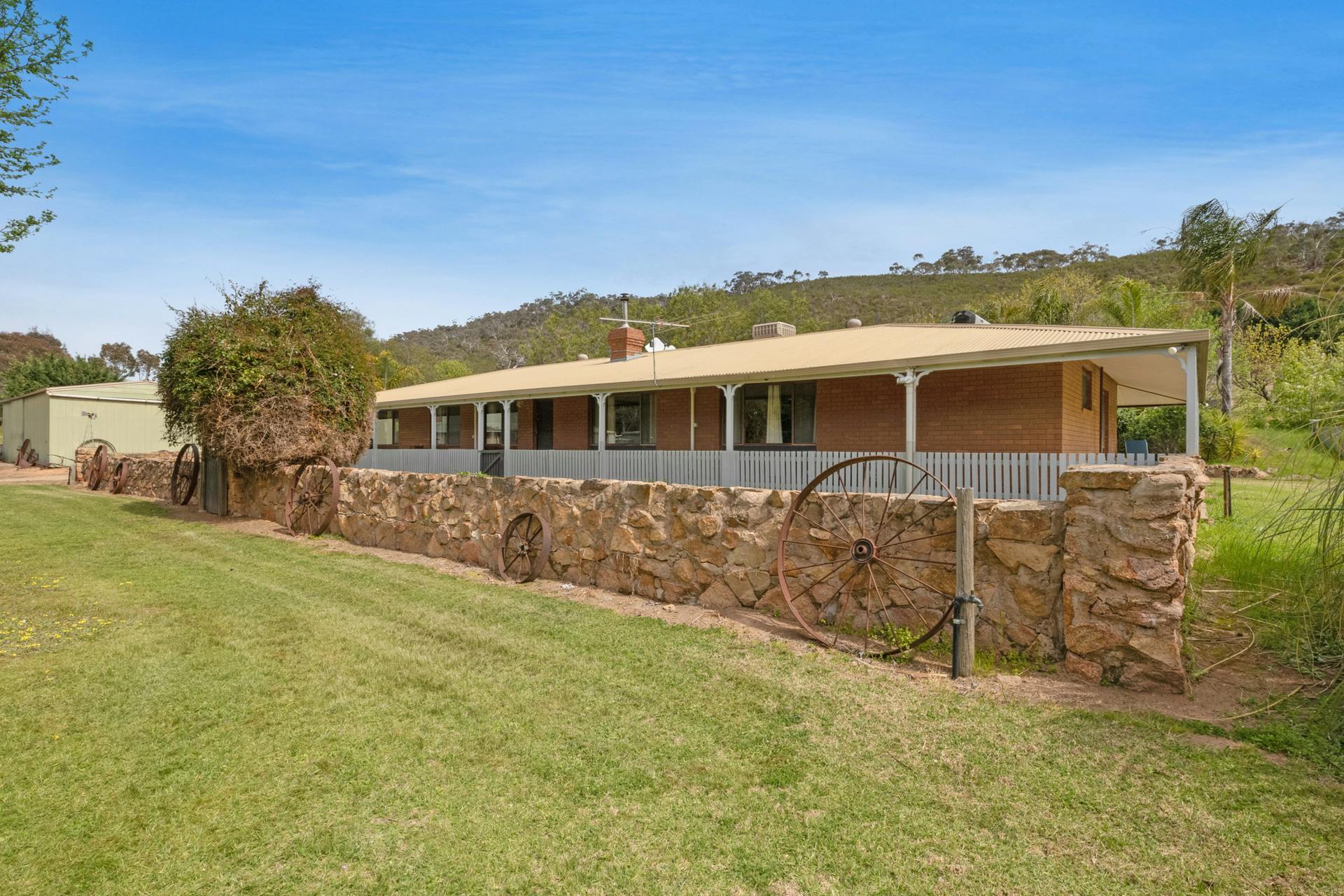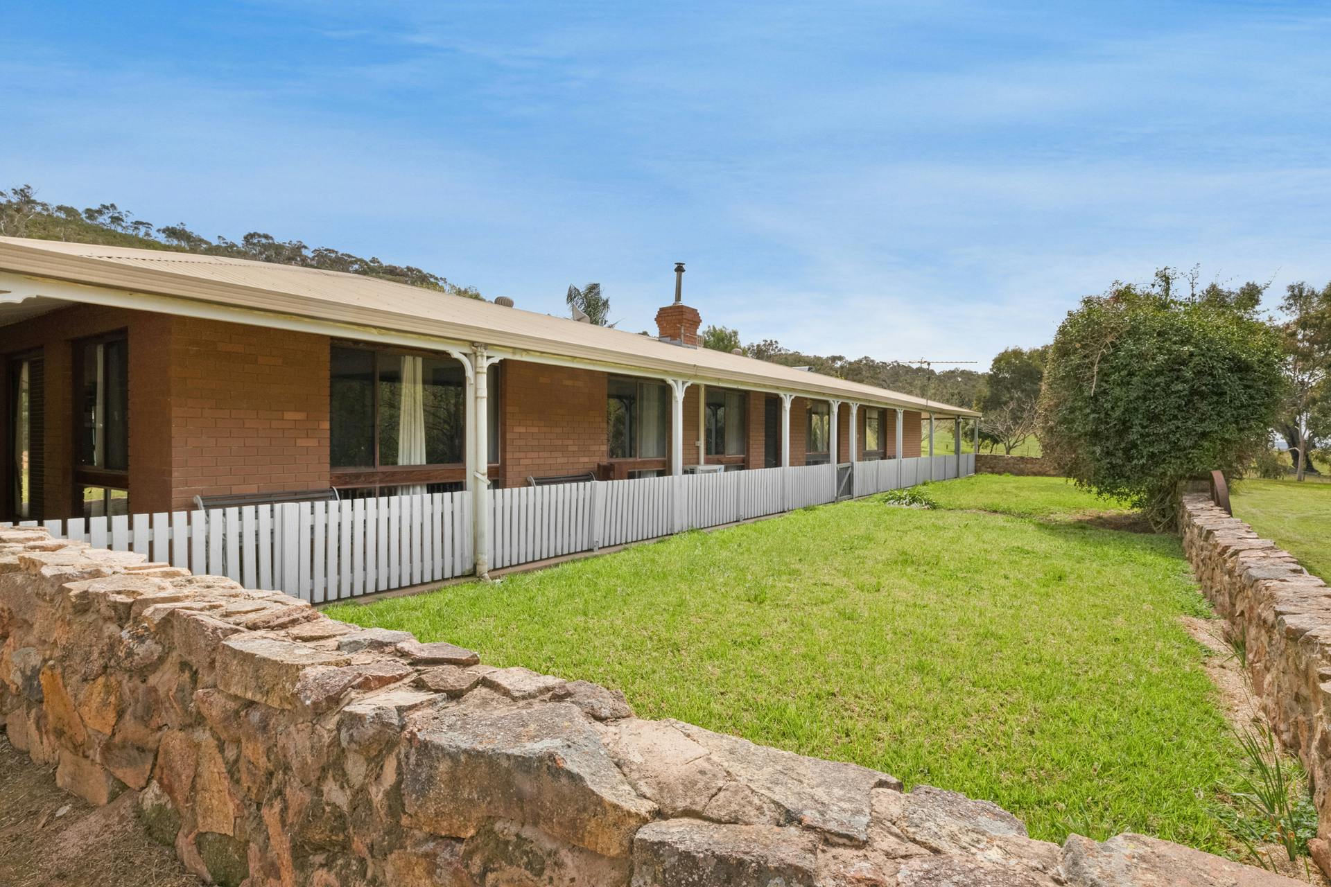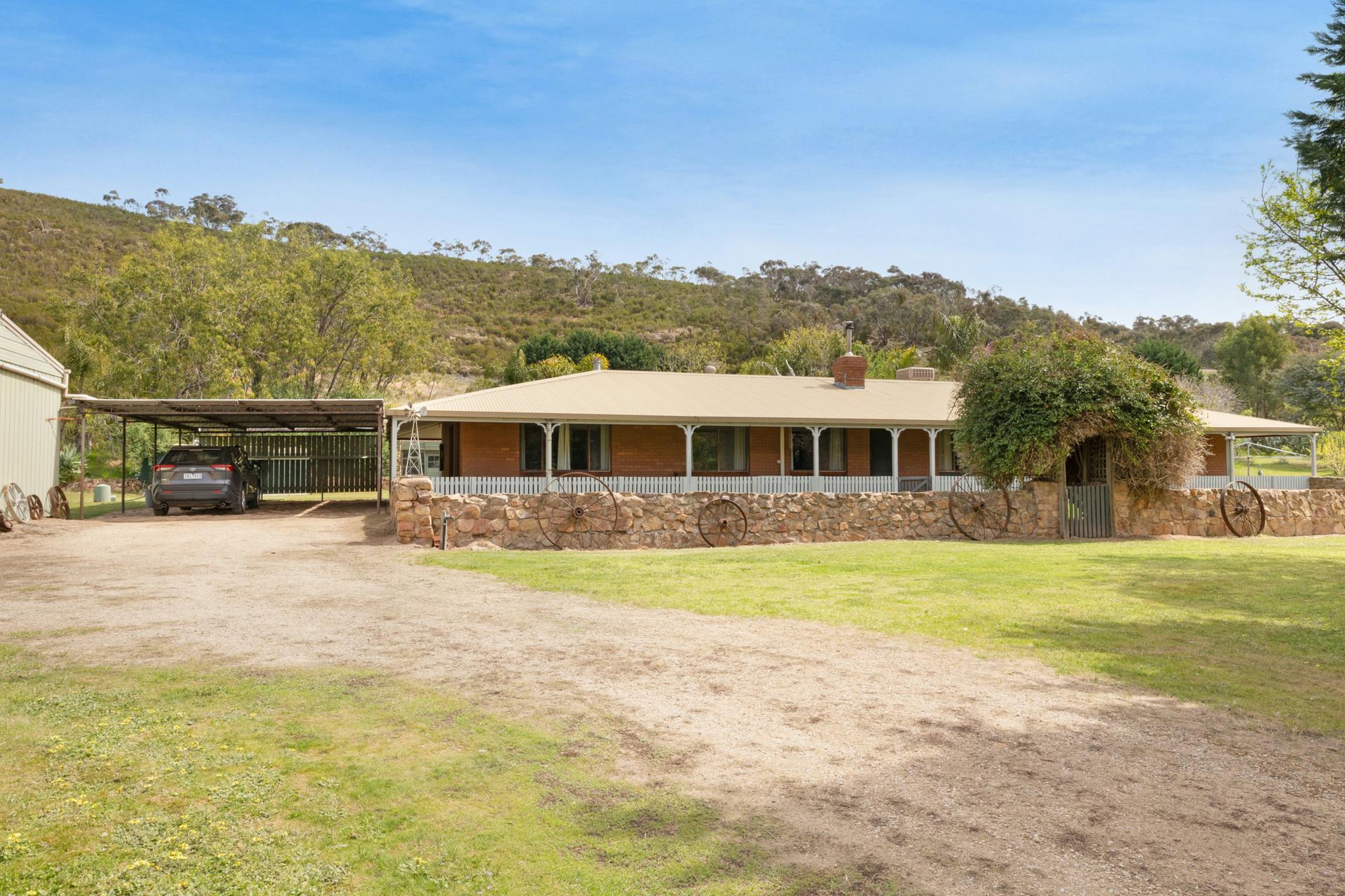 The circa 1970s homestead is large, spacious and solidly constructed, showcasing distinctive stonework feature walls and generous proportions throughout. Offering five bedrooms and two bathrooms, the home includes expansive living areas, gas cooking complemented by a combustion stove, Coonara wood heating, evaporative cooling and split-system air conditioning.