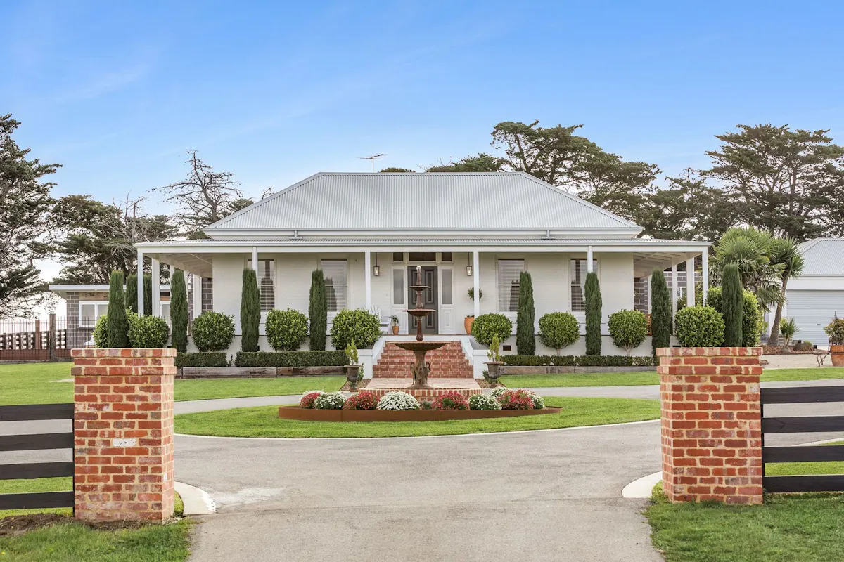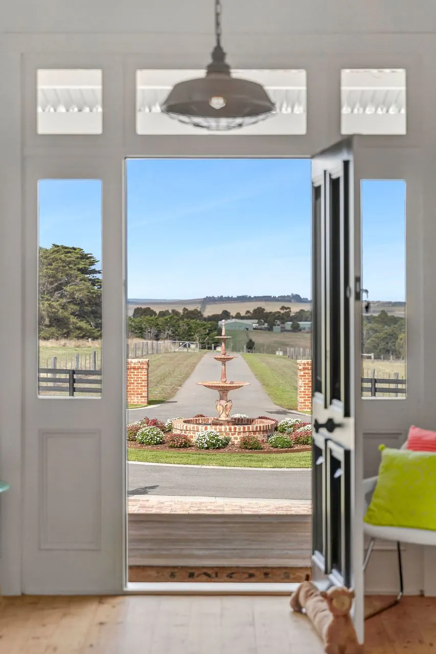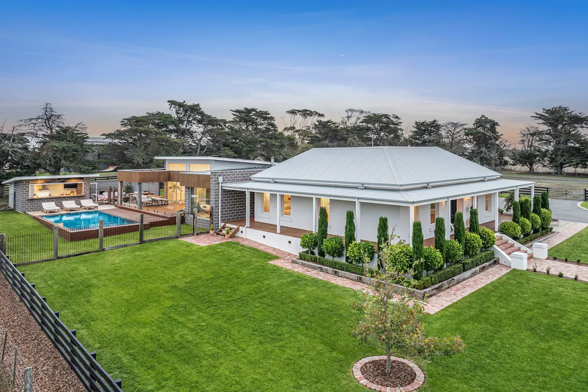 Situated on 40 ha – 100acres in the prestigious Barrabool Hills, this exceptional lifestyle residence offers a rare blend of scale, craftsmanship, and resort-style luxury. Privately set among rolling pastures and mature shelter belts, the home enjoys expansive views and a strong sense of seclusion, while being confidently positioned within its natural landscape. This is a fully realised rural property where refined design and luxurious liveability meet the quiet beauty of the countryside.The architecture is both striking and timeless, combining Old Geelong red brick, reclaimed timber posts from Melbourne wharfs, and expansive glazing. Distinct wings are connected by glazed breezeways, reinterpreting the traditional homestead in a contemporary form. High ceilings, bespoke joinery, timber floors, and plush wool carpets soften the accommodation areas, while polished concrete floors define the main living zones. Large windows throughout create a seamless connection between indoors and the surrounding Barrabool Hills landscape.