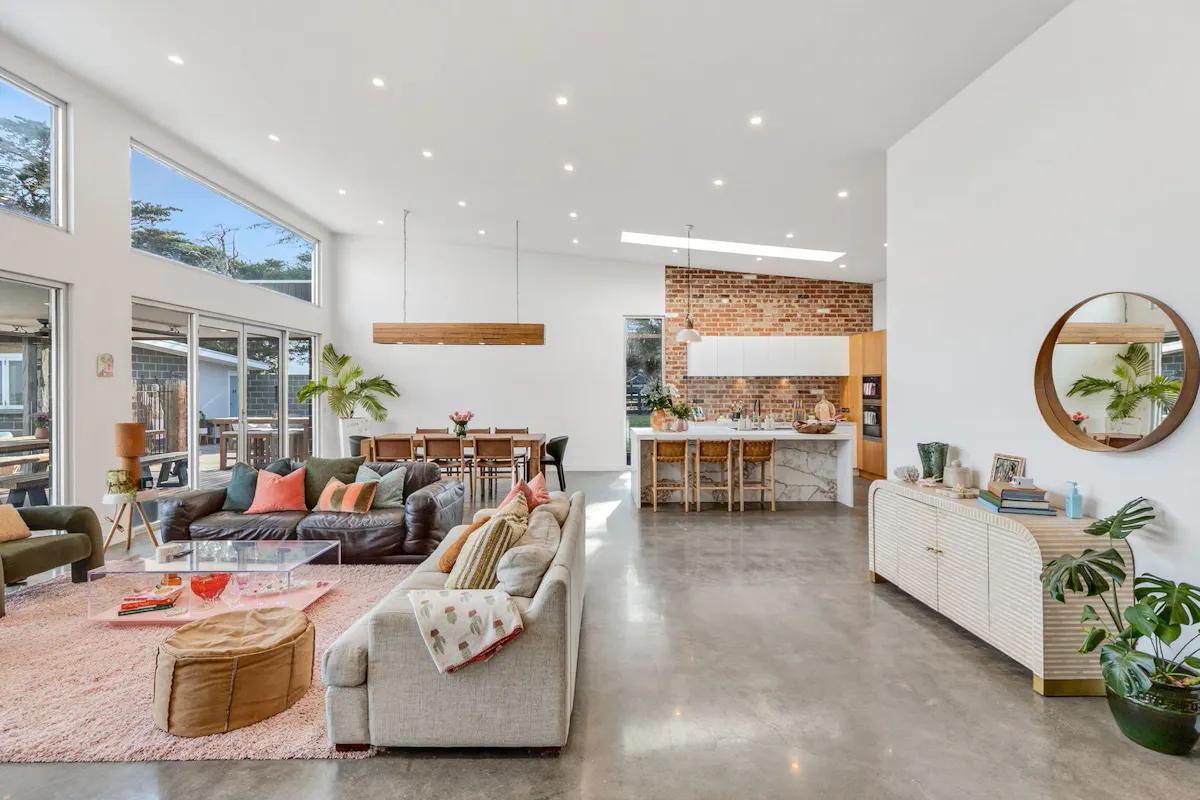 The main suite offers a private retreat, introduced by a recycled timber barn door. With polished concrete floors, large picture windows, and views across the pool and hills, it is a calm and refined space. Additional bedrooms, multiple living zones, and wellness areas provide flexibility and privacy throughout the home.