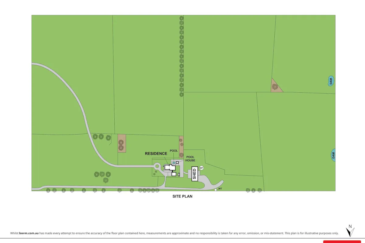 Two dams, a spring, and six fenced paddocks support equine use, grazing, or small-scale agriculture.