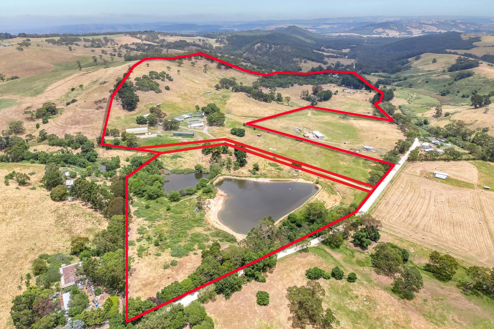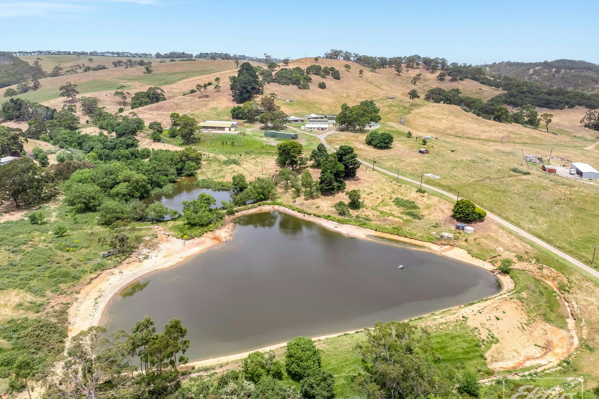 Set well back from the road and framed by gently undulating hills and scattered gum trees, the land itself is both picturesque and productive. Five fenced paddocks provide solid stock carrying capacity, supported by an average annual rainfall of approximately 760mm. Two dams service the property, including one substantial water body that draws abundant birdlife and creates a striking natural centrepiece.